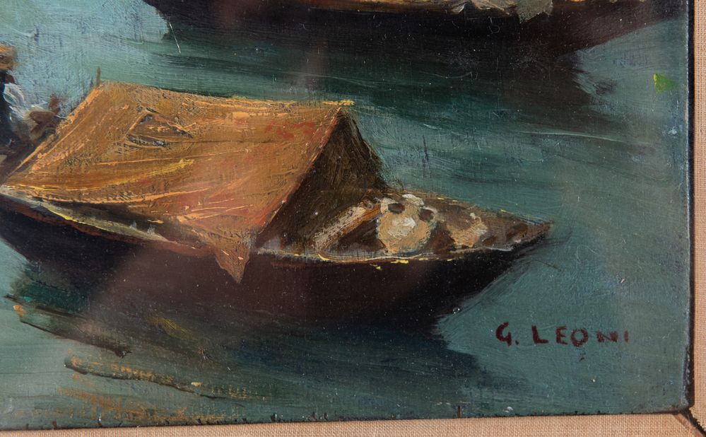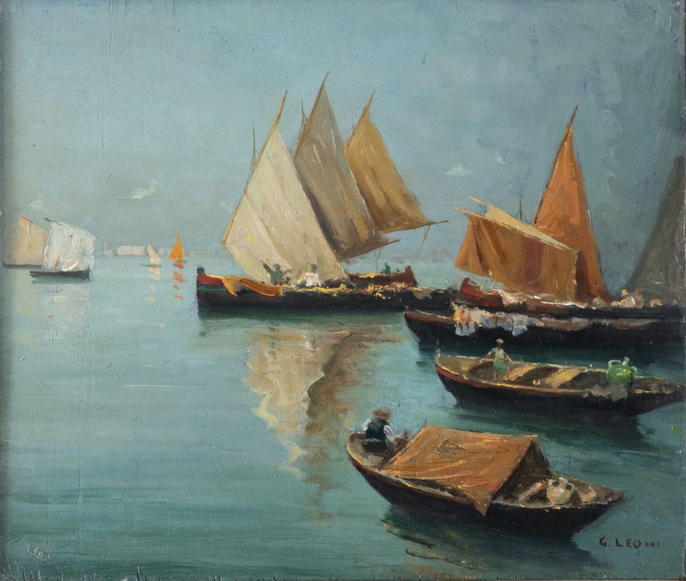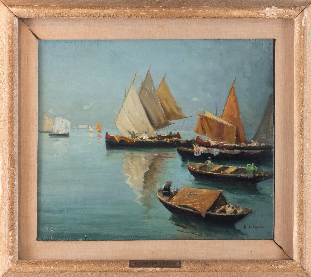 GIUSEPPE LEONI (Catania 1876 - 1927) "Marina". Olio su tavola. Cm 30,5x36. Opera firmata in basso a destra G. Leoni.