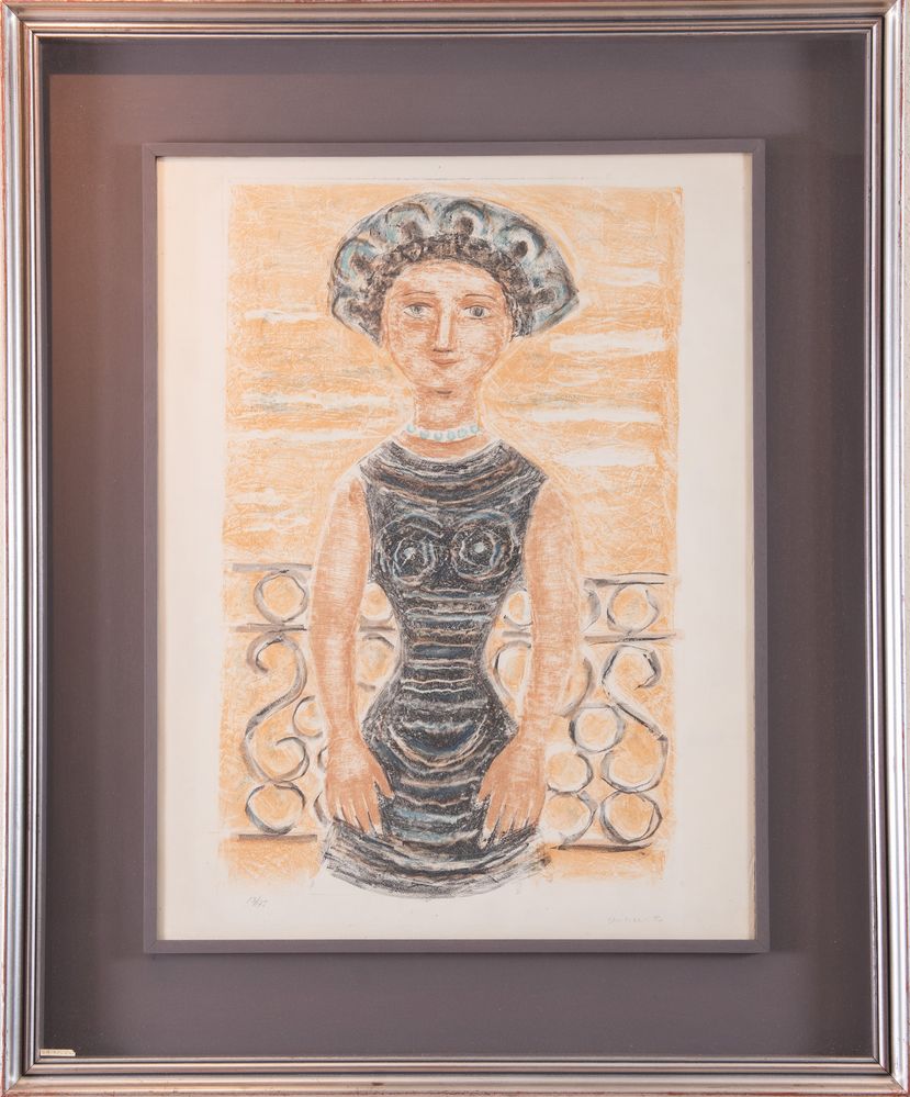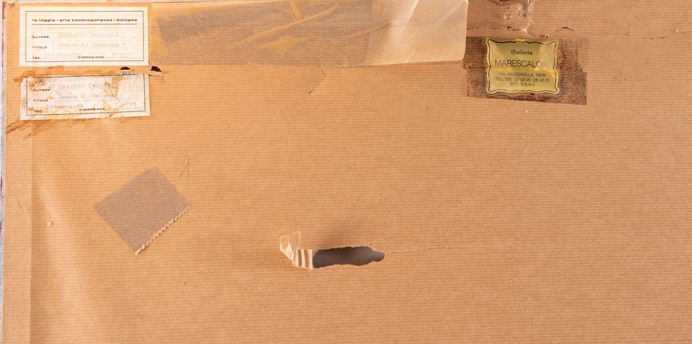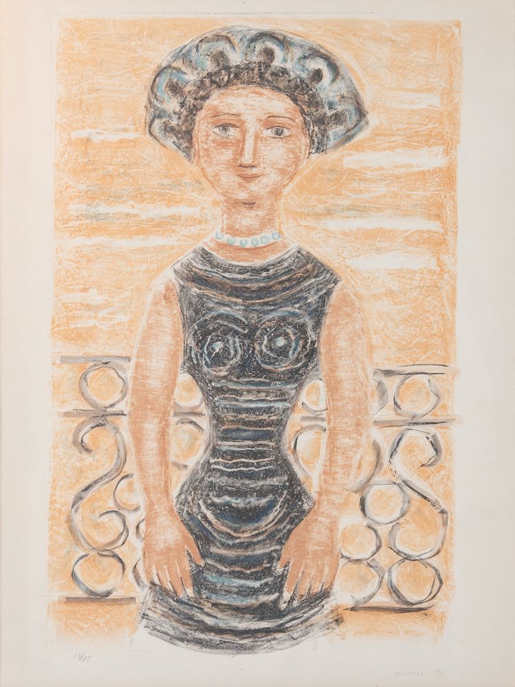 MASSIMO CAMPIGLI (Berlino 1895 - Saint Tropez 1971) "Donna al balcone". Litografia a colori su carta. Lastra: cm 60x38,5. Opera firmata in basso a destra Campigli M. Reca numeri di tiratura in basso a sinistra 13/175. Reca timbro a secco Prandi. Al retro reca etichette Galleria d'arte La loggia, Bologna.