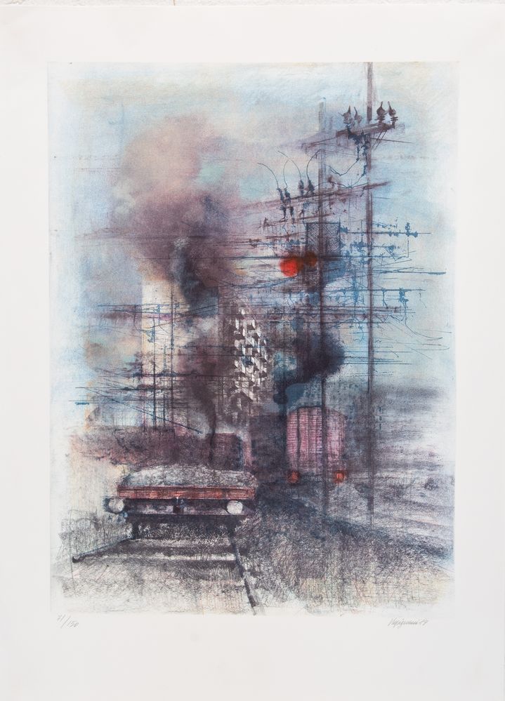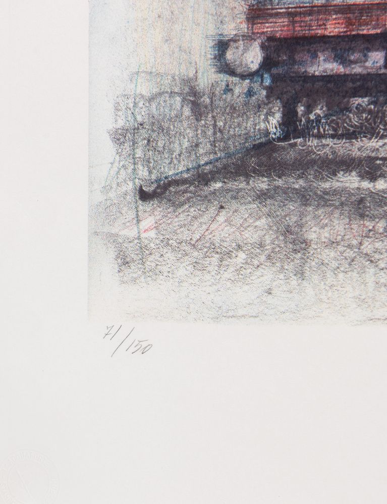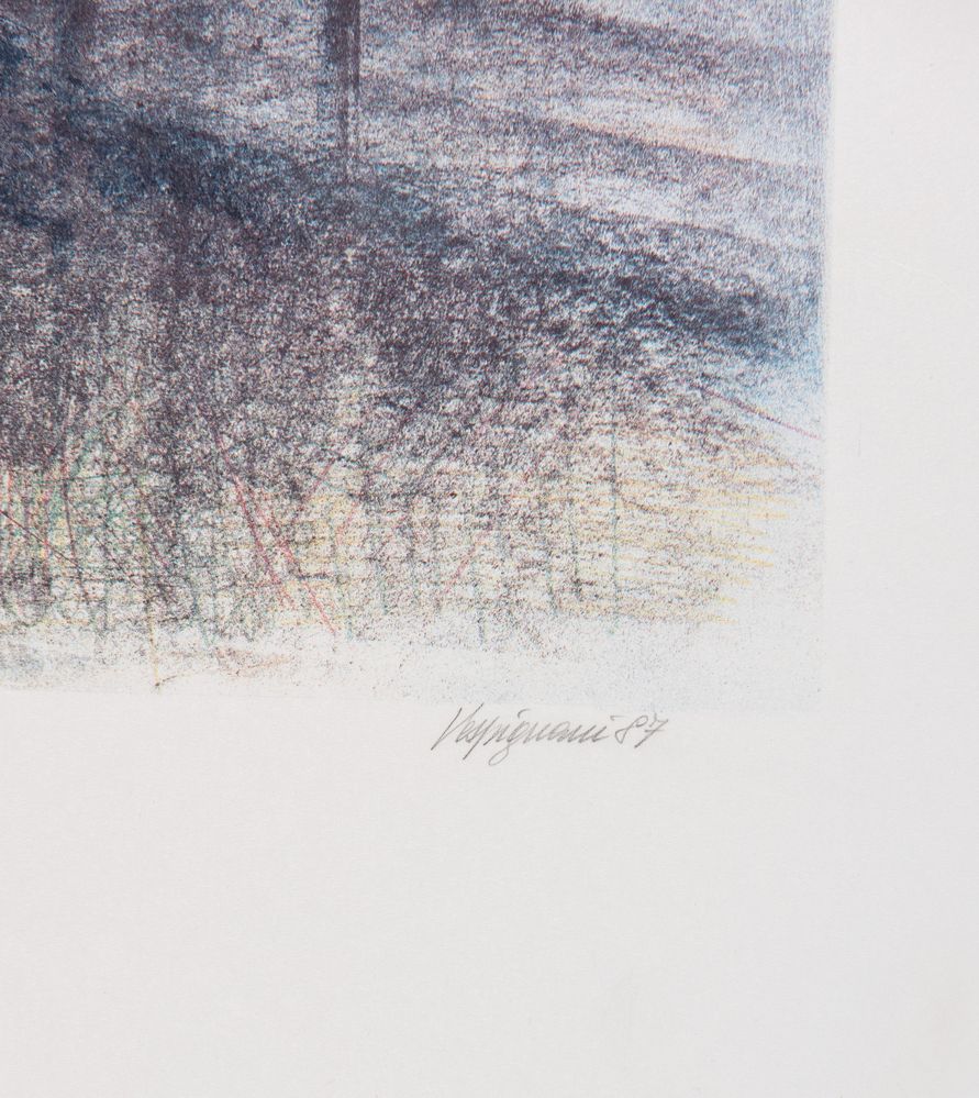 RENZO VESPIGNANI (Roma 1924 – 2001) "Periferia" 1987. Litografia a colori su carta. Foglio: cm 76x55,5. Opera firmata e datata in basso a destra Vespignani '87. Reca numeri di tiratura in basso a sinistra 71/150. Reca timbro stamperia l'Acquaforte Roma.