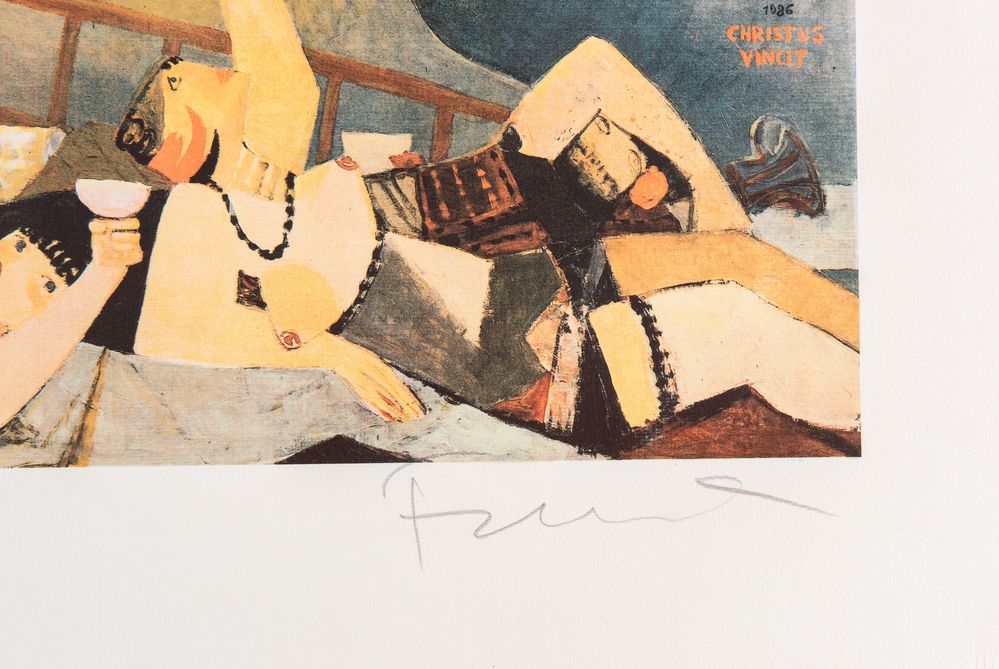 SALVATORE FIUME (Comiso 1915 - Milano 1997) "Cristus vincit". Litografia a colori su carta. Foglio: cm 59x80. Opera firmata in basso a destra Fiume. Reca numeri di tiratura in basso a sinsitra 64/120. Reca timbro a secco Fiume Controlled.