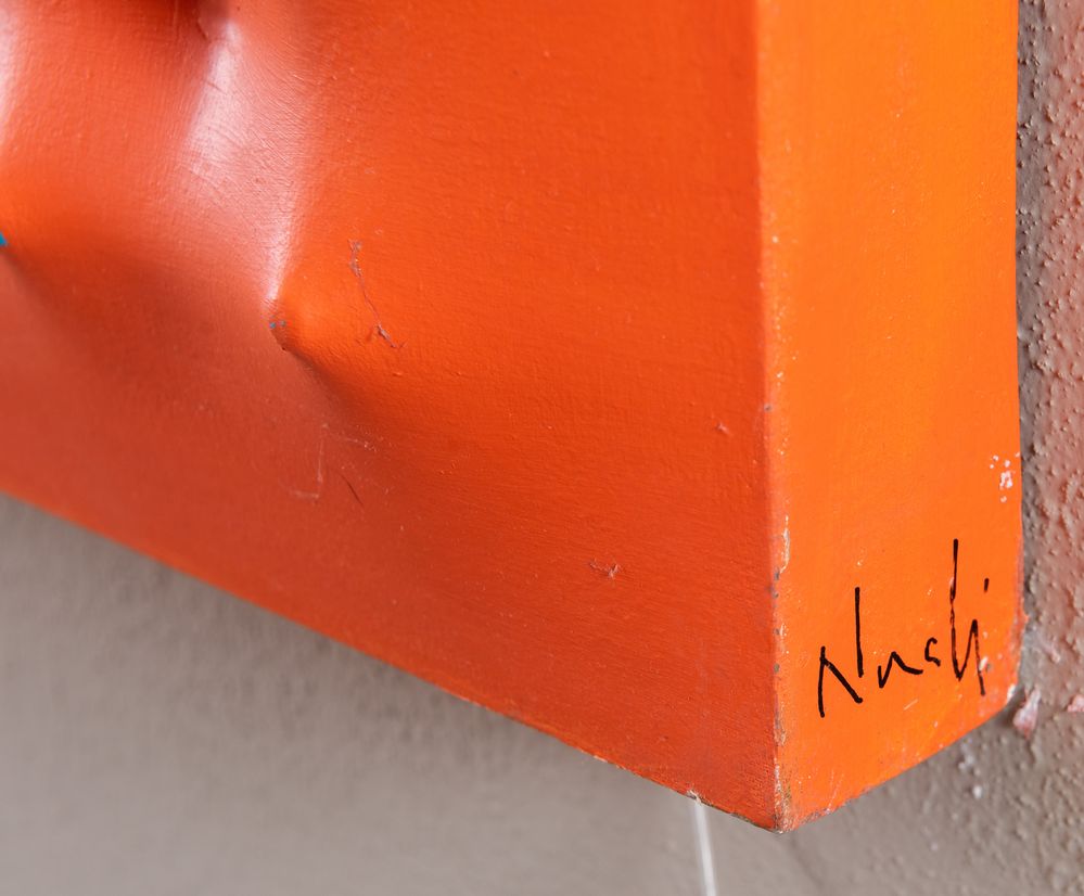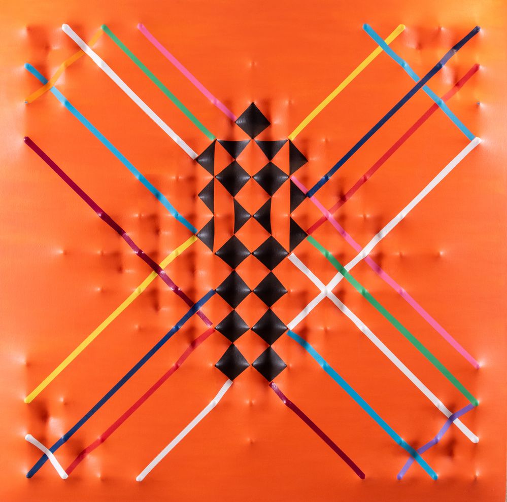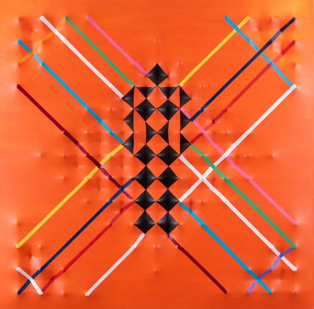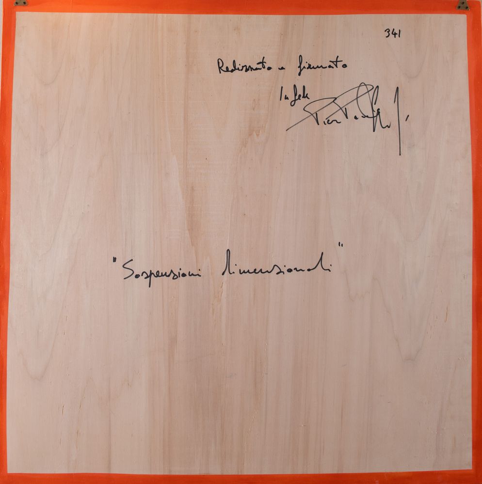 PIER PAOLO NUDI (San Marco Argentano 1971) "Sospensioni dimensionali". Olio su tela estroflessa. Cm 100x100. Opera firmata al retro Pierpaolo Nudi. Opera intitolata al retro "Sospensioni dimensionali”.