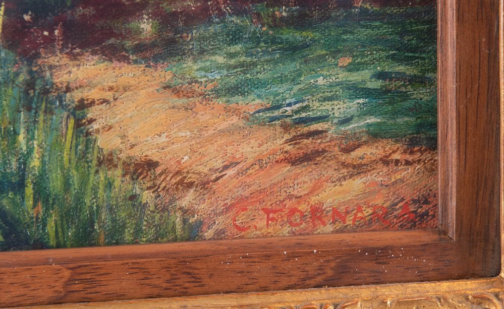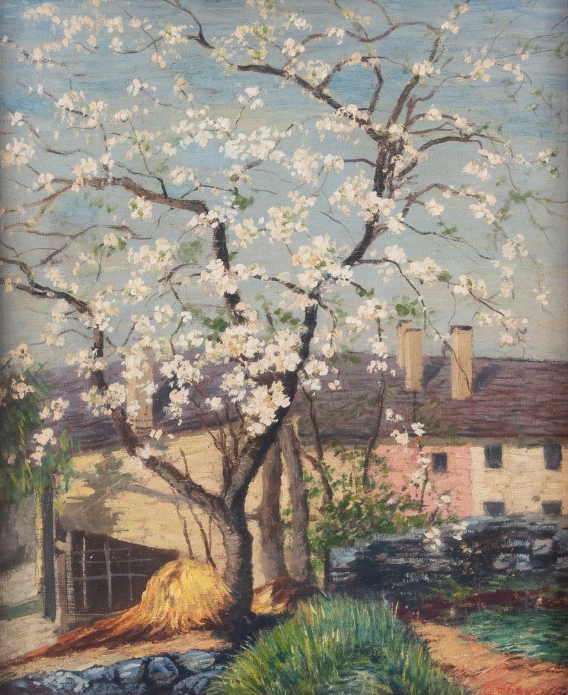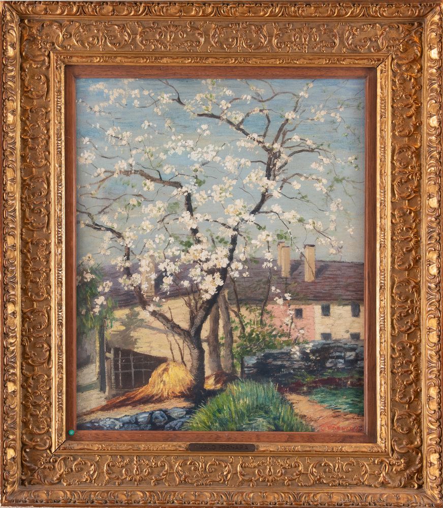CARLO FORNARA (Prestinone 1871 - Craveggia 1968) "Paesaggio con ciliegio". Olio su tela. Cm 55x45,5. Opera firmata in basso a destra C. Fornara.