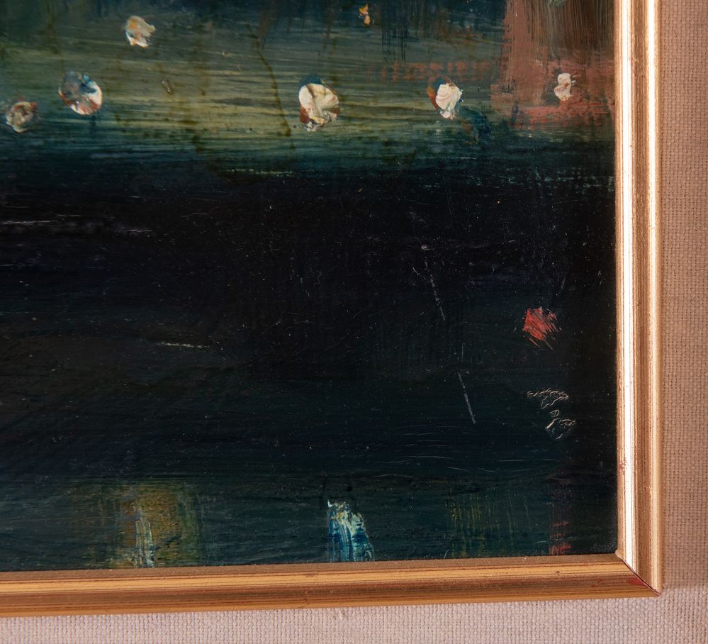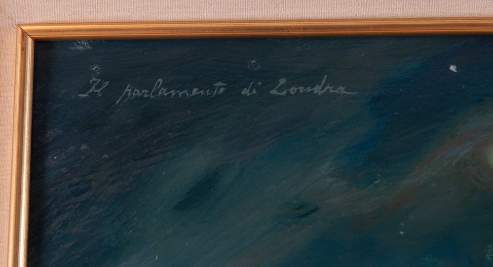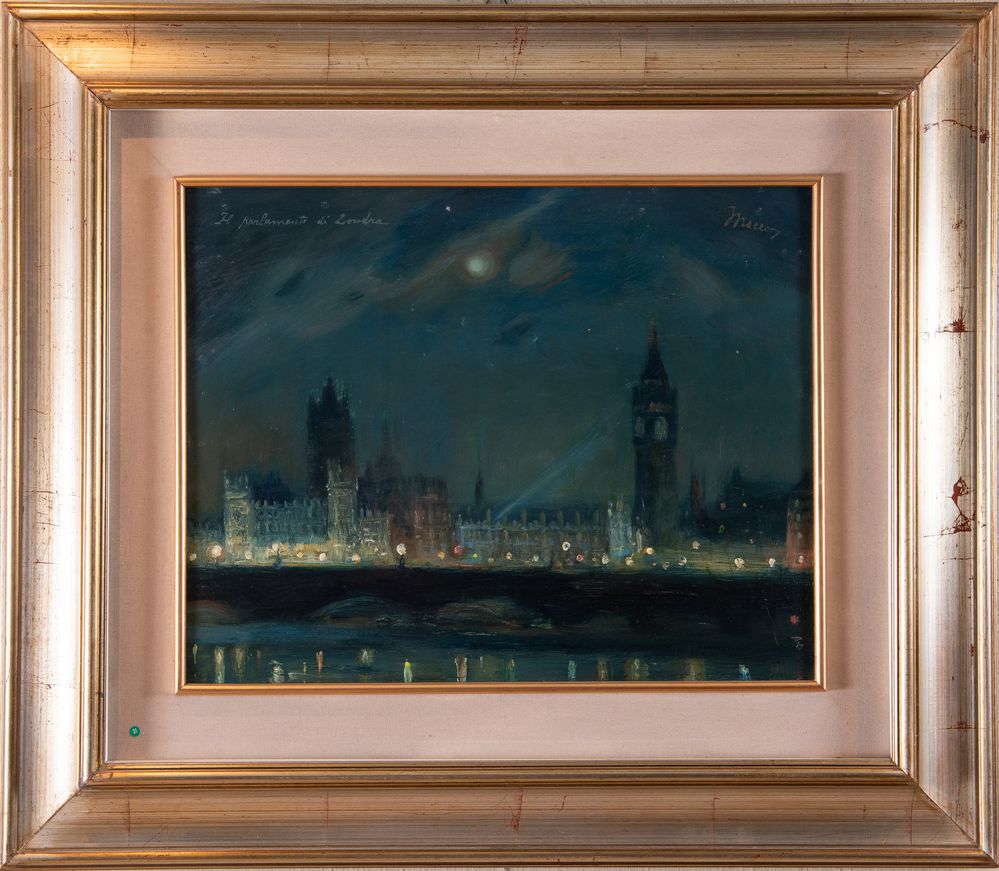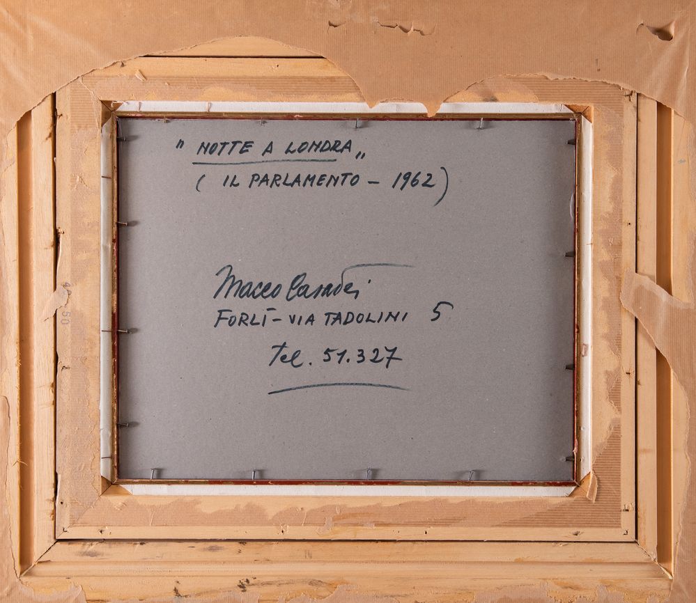 MACEO CASADEI (Forlì 1899 - 1992) "Il parlamento di Londra", 1962. Olio su tavola. Cm 37,5x47,5. Opera firmata in alto a destra Maceo. Opera intitolata in alto a sinistra Il parlamento di Londra. Al retro opera firmata e datata Maceo Casadei 1962.