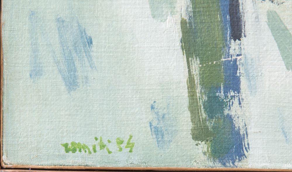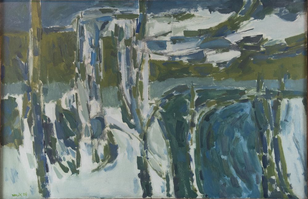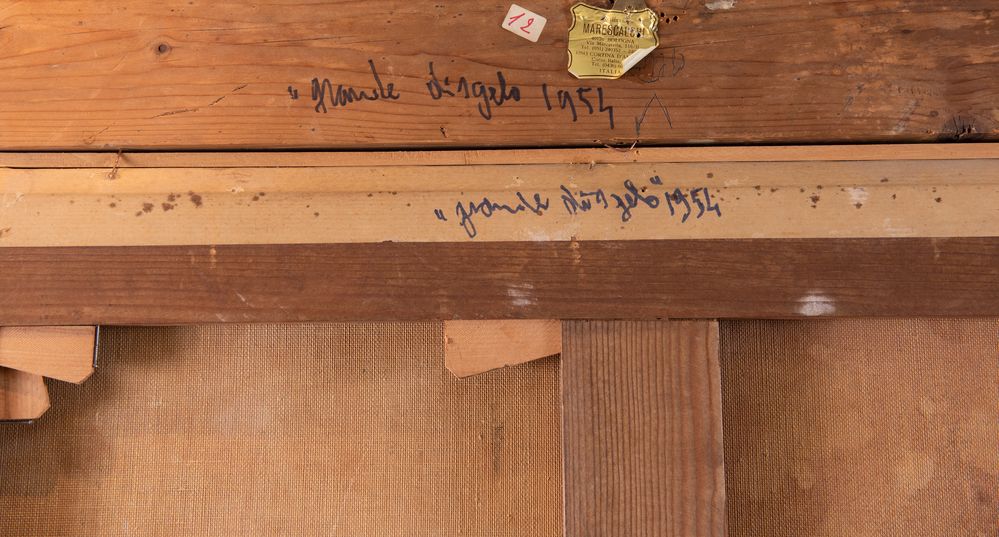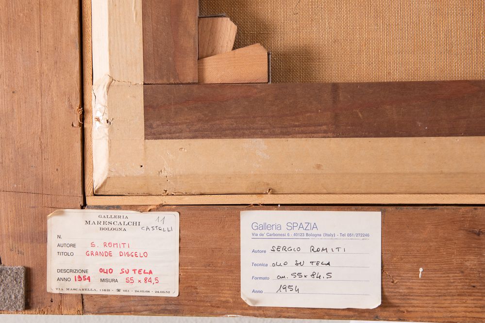 SERGIO ROMITI (Bologna 1928 – 2000) "Il grande disgelo", 1954. Olio su tela. Cm 55x85,5. Opera firmata e datata in basso a sinistra Romiti 54. Al retro reca etichetta della Galleria d'Arte Mario Marescalchi con sigla di Mario Marescalchi. Al retro reca etichetta della Galleria d'arte Spazia, Bologna. Pubblicazione: catalogo generale di Sergio Romiti, vol. I.
