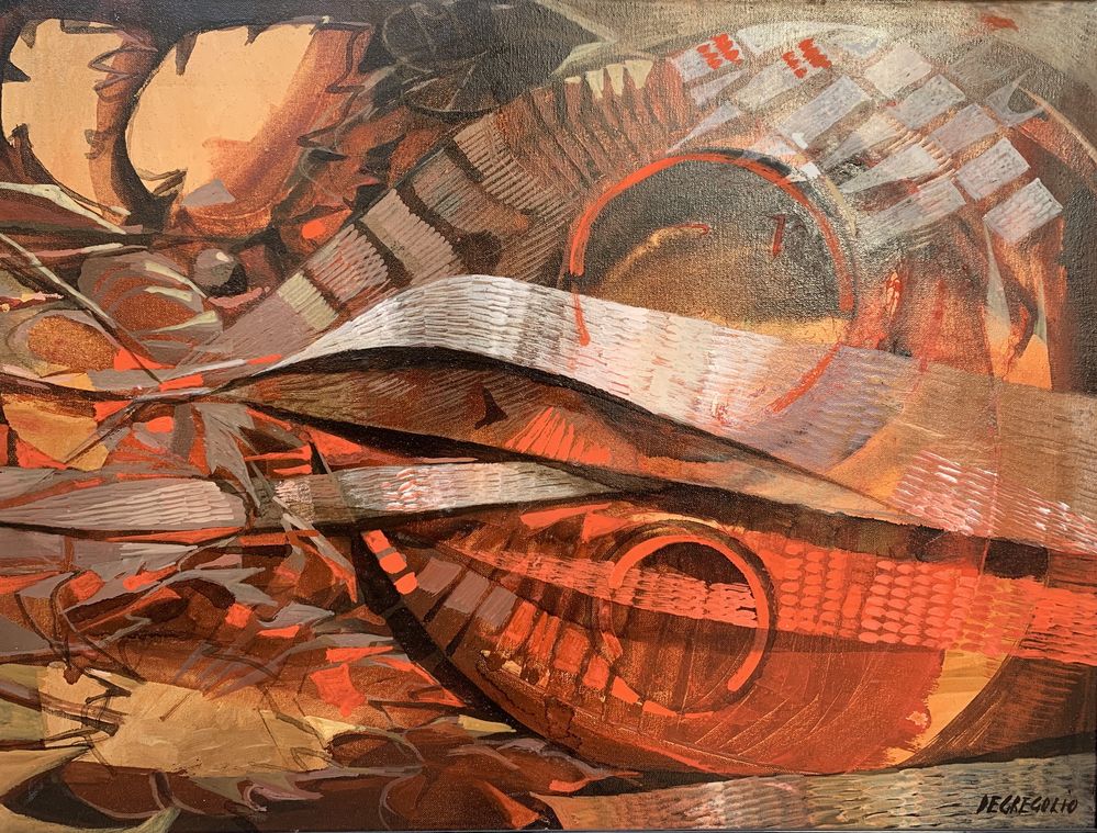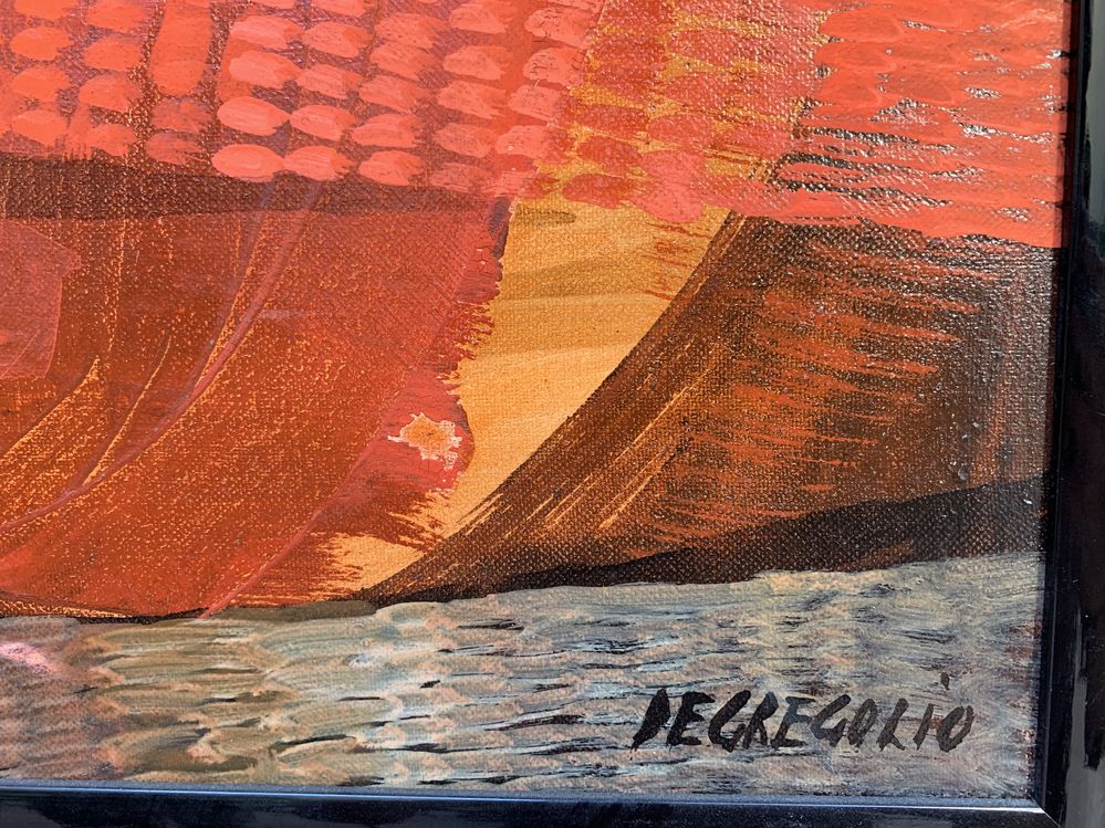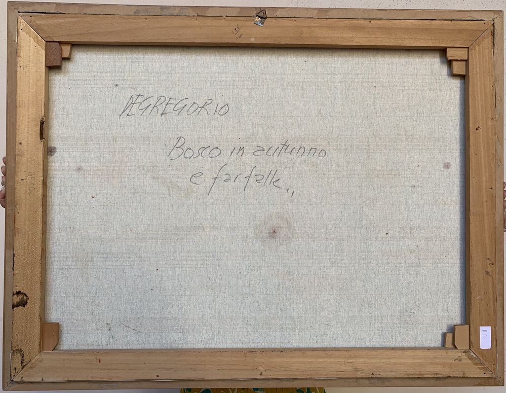 GIUSEPPE DE GREGORIO (Spoleto 1920 - 2007) "Bosco in autunno e farfalle". Olio su tela. Cm 60x80. Opera firmata in basso a destra De Gregorio. Al retro opera firmata e intitolata De Gregorio Bosco in autunno e farfalle.