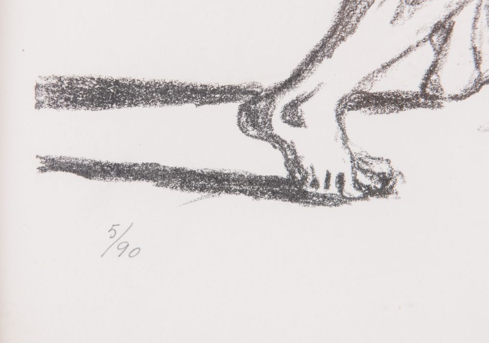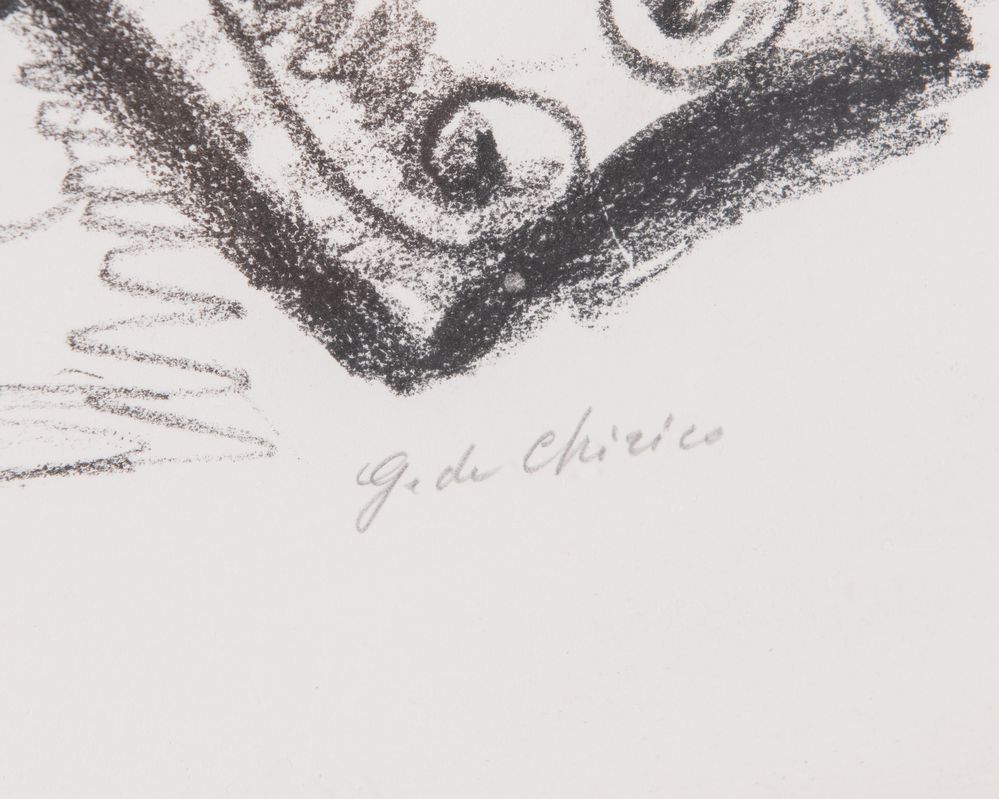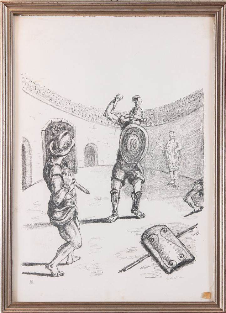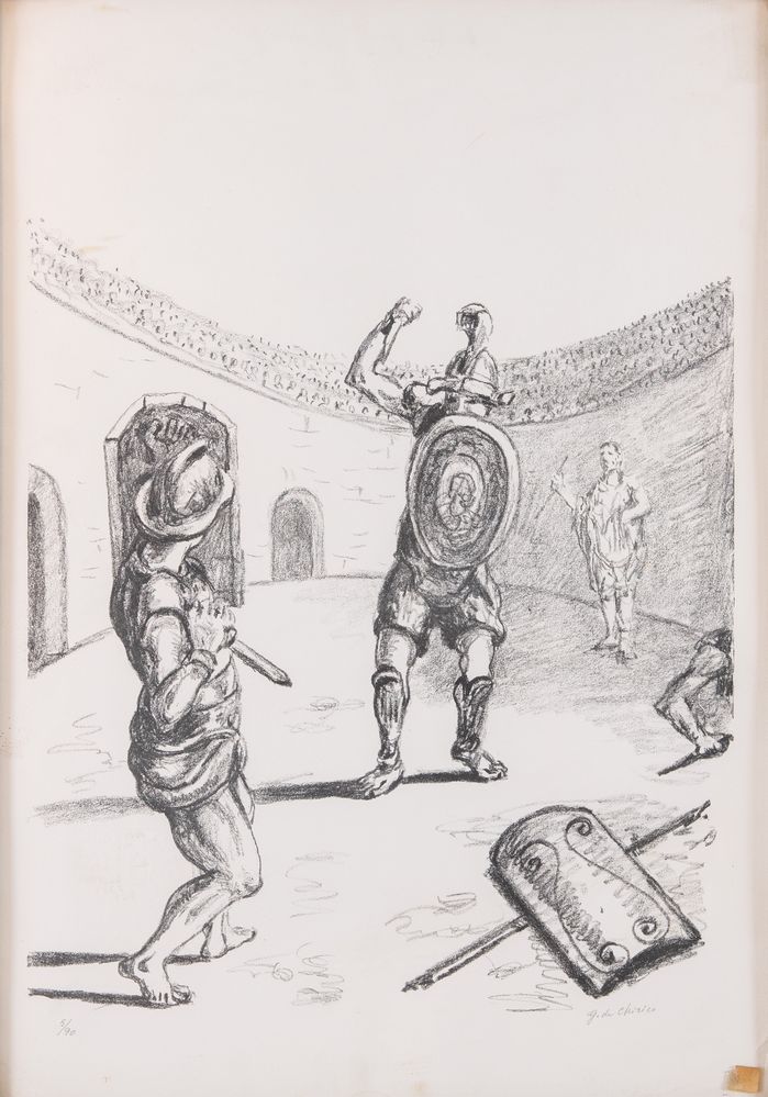 GIORGIO DE CHIRICO (Volo 1888 - Roma 1978) "Gladiatori nell'arena", 1969. Litografia su carta. Cm 72x50,5. Opera firmata in basso a destra G. de Chirico. Reca in basso a sinistra numeri di tiratura 5/90. Al retro reca timbro di The Old Shop Antichità. Pubblicazione: Alfonso Ciranna, Giorgio de Chirico, catalogo delle opere grafiche (incisioni e litografie) 1921-1969, A. Ciranna Ed. Milano - Ed. La Medusa, Roma, 1969, p. 187, n. 164; Antonio Vastano, Giorgio de Chirico. Catalogo dell'opera grafica 1921-1969, Edizioni Bora, Bologna, 1996, p. 255, n. 167.