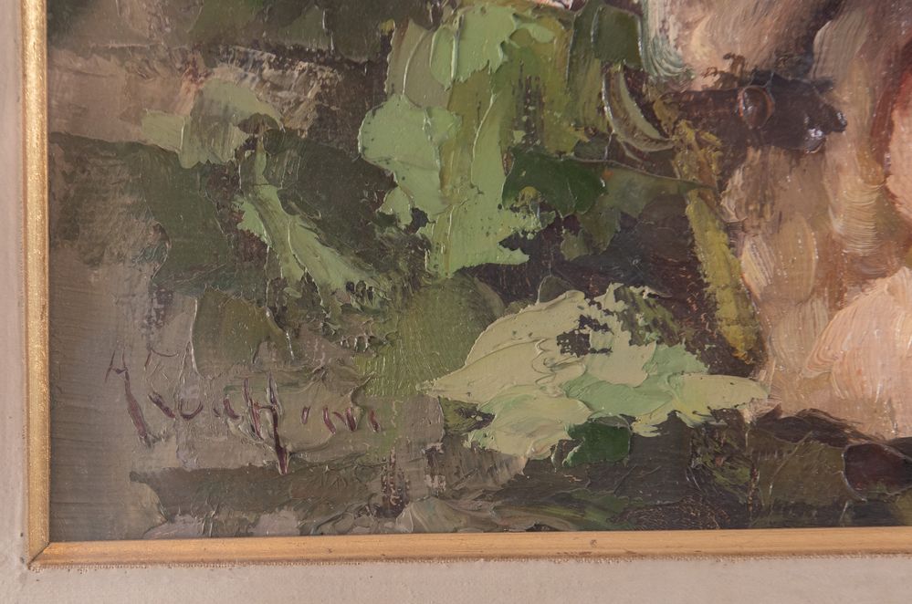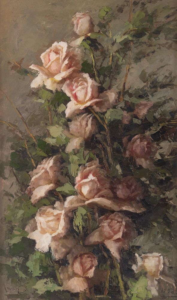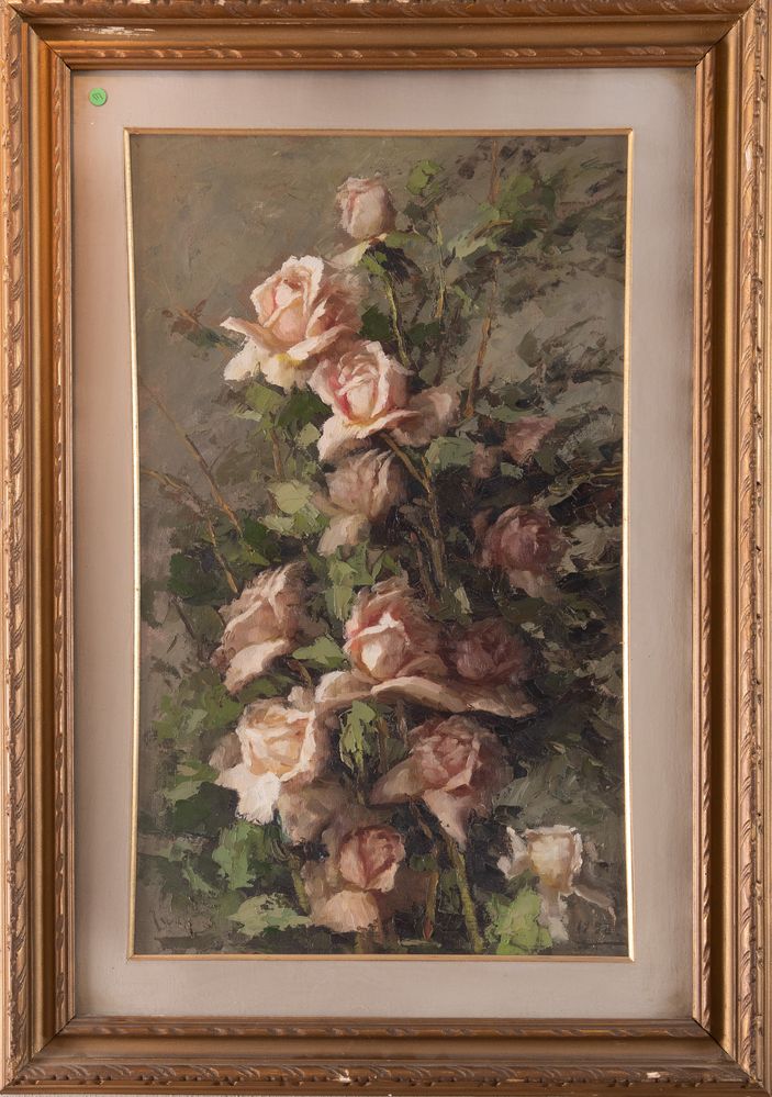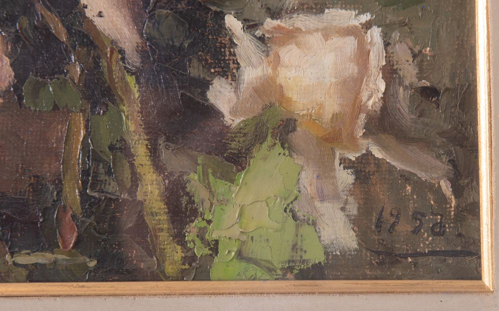 AGOSTINO ZUCCHINI (Fiesso di Budrio 1894 - Bologna 1972) "Rose", 1956. Olio su tela applicata su faesite. Cm 66x40,5. Opera firmata in basso a sinistra Zucchini. Opera datata in basso a destra 1956.
