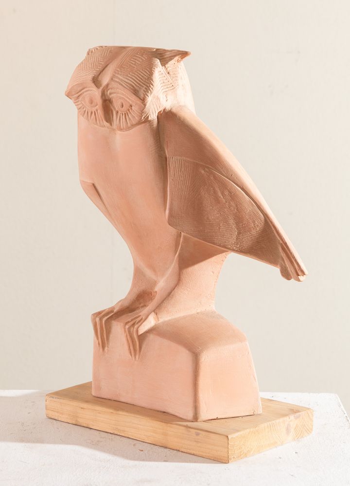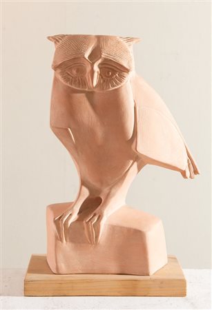 CLAUDIO NICOLI (San Giovanni in Persiceto 1958) "Civetta". Scultura in terracotta. Cm 36x26x12. Al retro opera firmata Nicoli.
