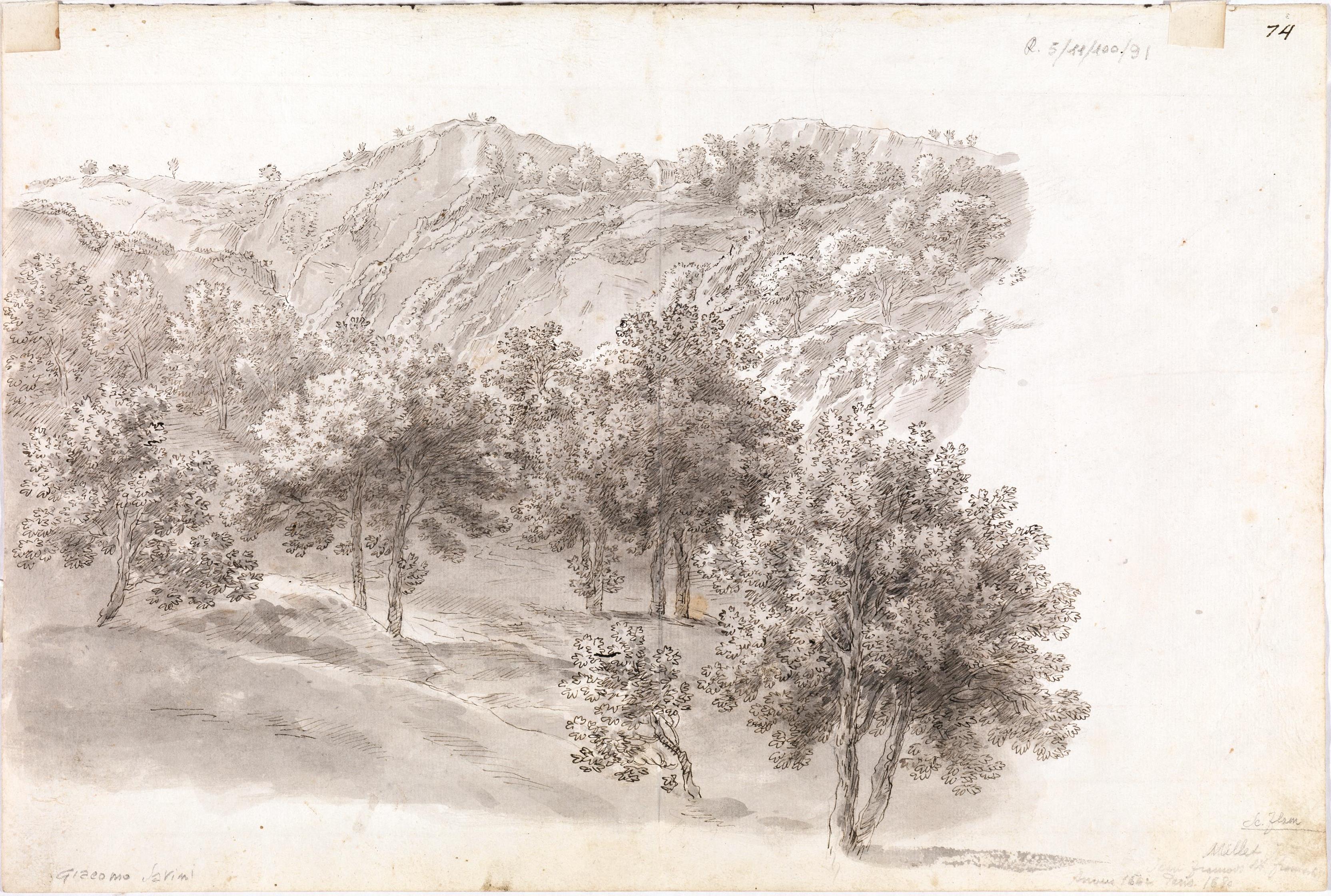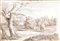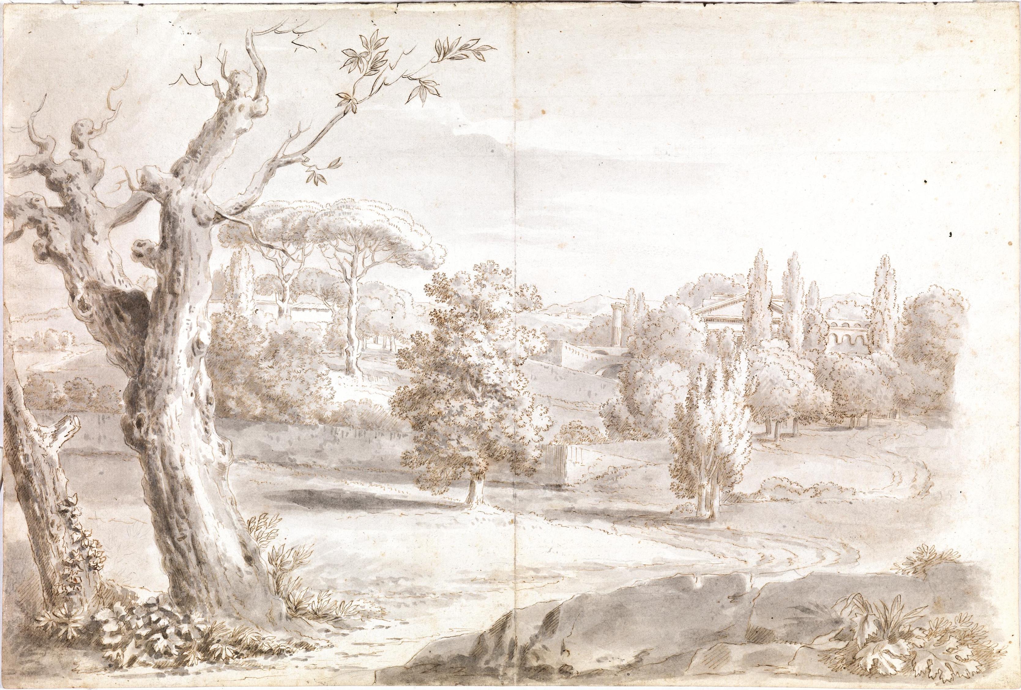 Penna e inchiostro bruno e acquerello grigio su carta vergellata. mm 285x423. Al verso: Paesaggio collinare con alberi.