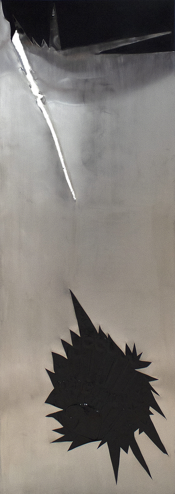 Franco Angeli, Pluribus Unum, 1966, lamina acciaio su legno, cm 300x120. Pubblicato nella collezione Marzotto. Archivio Fondazione Franco Angeli.