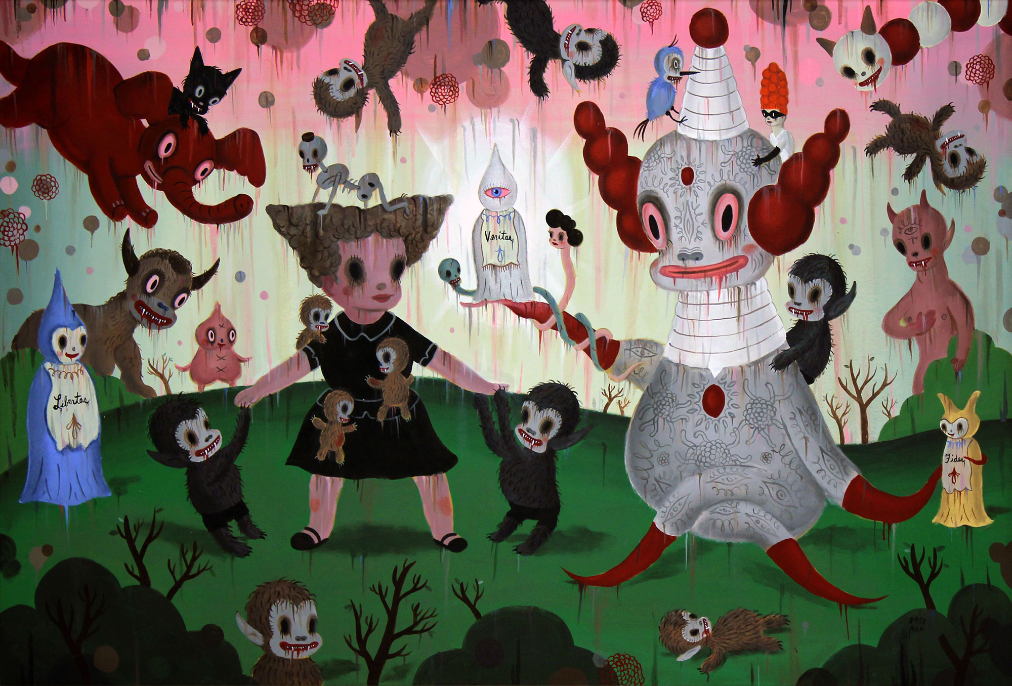 Gary Baseman, Birth of the domesticated , 2012, acrilico su tela, cm 120x185. Autentica a cura dell'artista. Opera pubblicata in copertina sul catalogo generale edito da TASCHEN 'Portraits' a cura di Julius Wiedemann