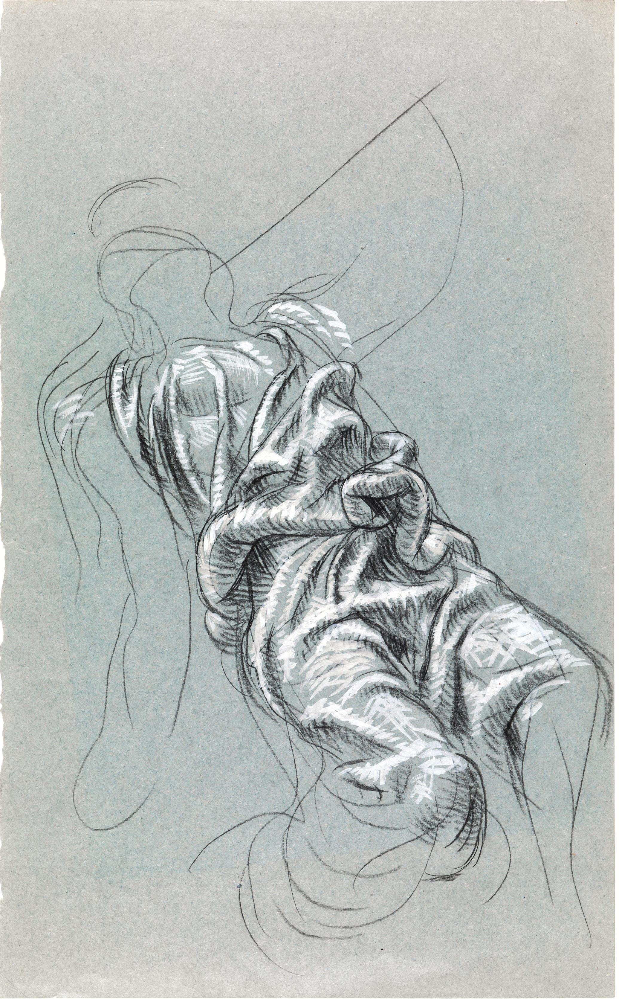 Gessetto nero e rialzi a tempera bianca su carta color grigio-verde. mm 452x280. Al verso: Schizzi di nudo. Matita rossa e verde e acquerello marrone con rialzi a tempera bianca.