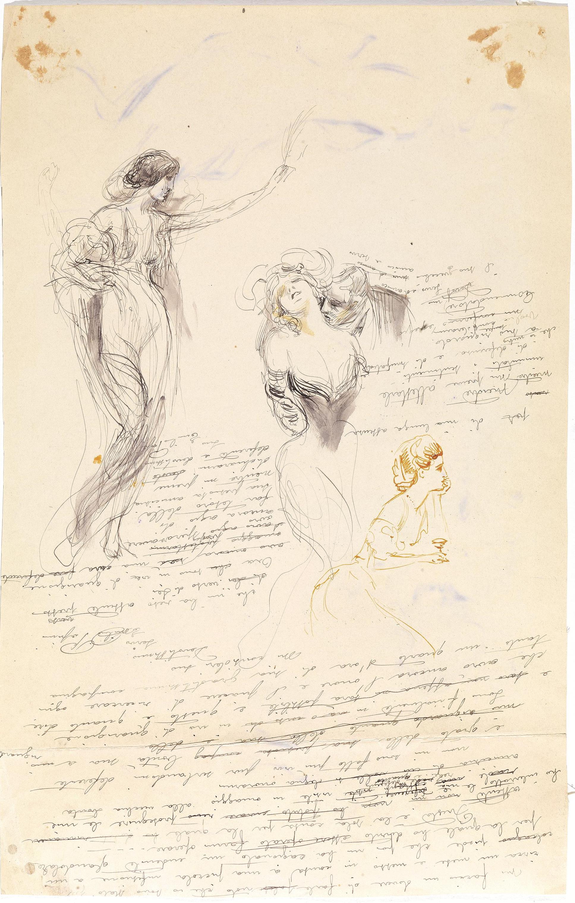 Emilio Papini, pittore, ritrattista, decoratore e scenografo fiorentino la cui produzione è poco nota. Il presente album contiene schizzi e disegni di grande qualità grafica, alcuni ispirati ad uno stile tardo simbolista della figura e dell’ornato.