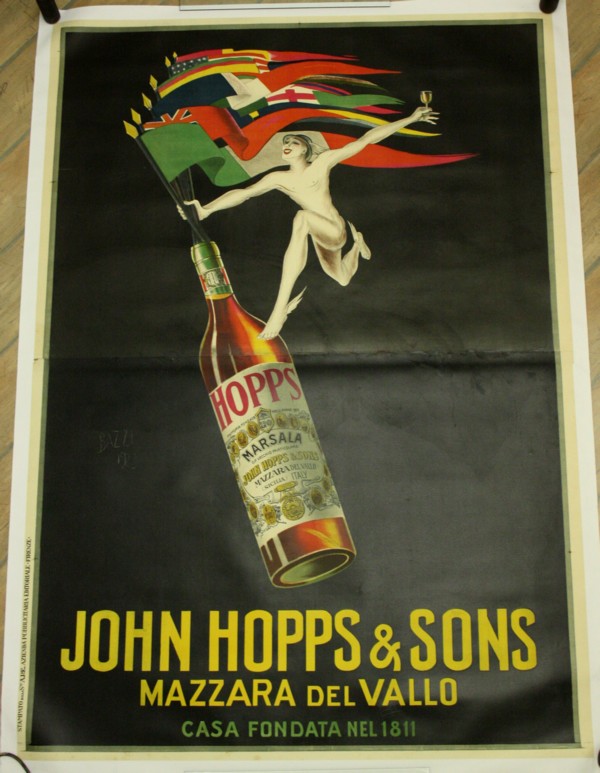 Firmato, datato. Manifesto pubblicitario su carta rintelata raff. ''MARSALA HOPPS'', disegnato da BAZZI. Anno 1923. Restauri. Mis. Lung. cm. 130 Alt. cm. 190 ca.