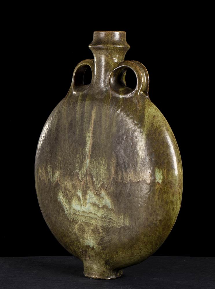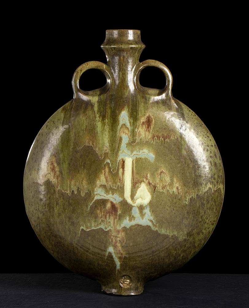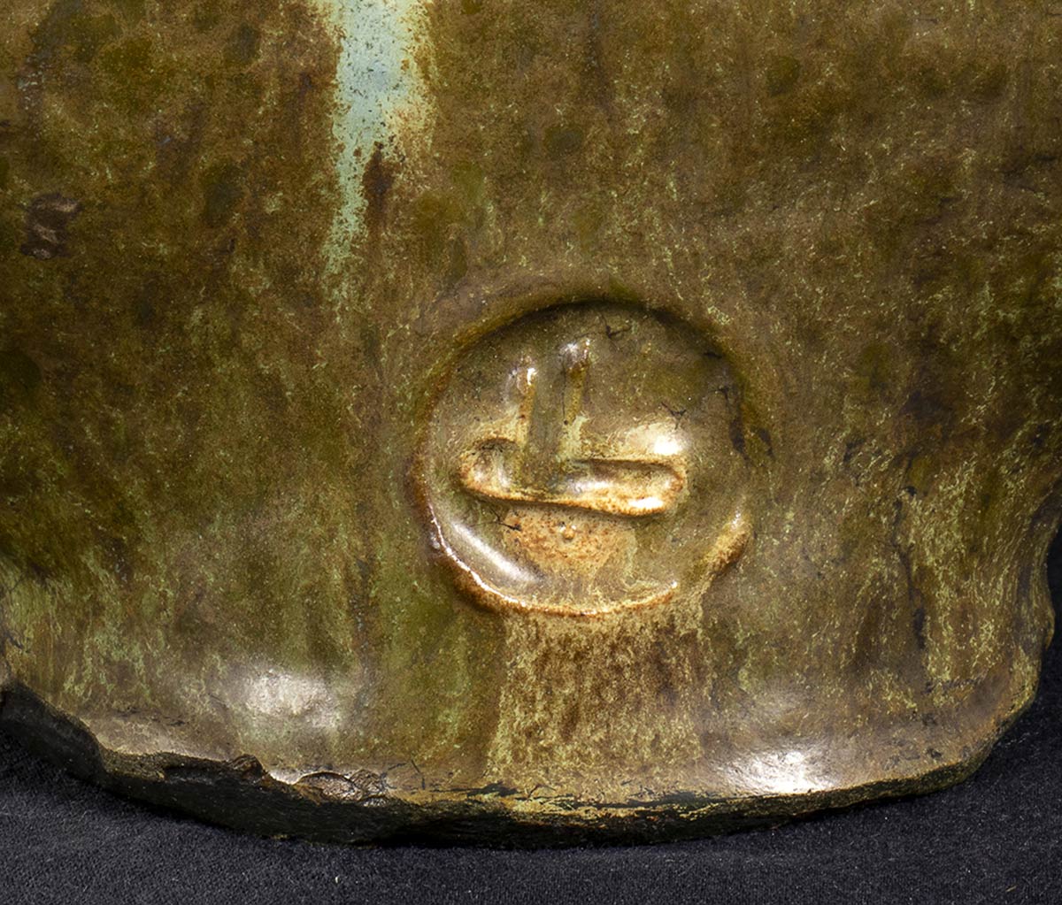 Il corpo circolare sostenuto da piccolo piede, tra la spalla e il collo cilindrico due grandi prese ad anello, l'esterno rivestito di invetriatura di tonalità verde con screziature policrome, carattere al centro della base.