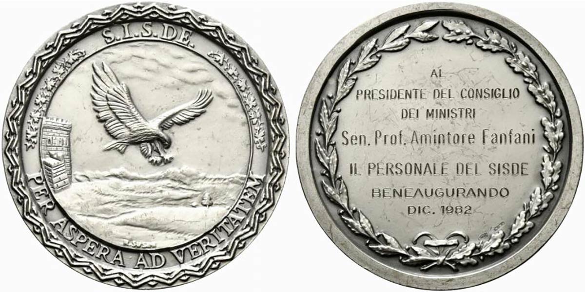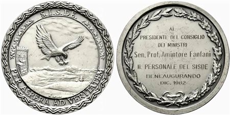 <br>S.I.S.D.E. (Servizio per le Informazioni e la Sicurezza Democratica). PER ASPERA AD VERITATEM. Medaglia 1982 Al Presidente del Consiglio dei Ministri Amintore Fanfani. Ag (99,10 g - 61,7 mm).