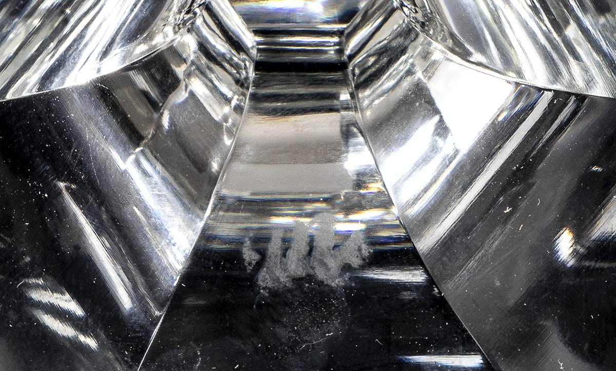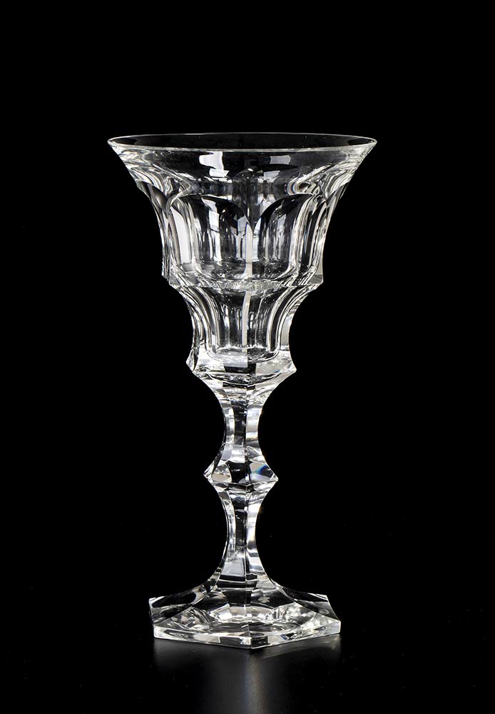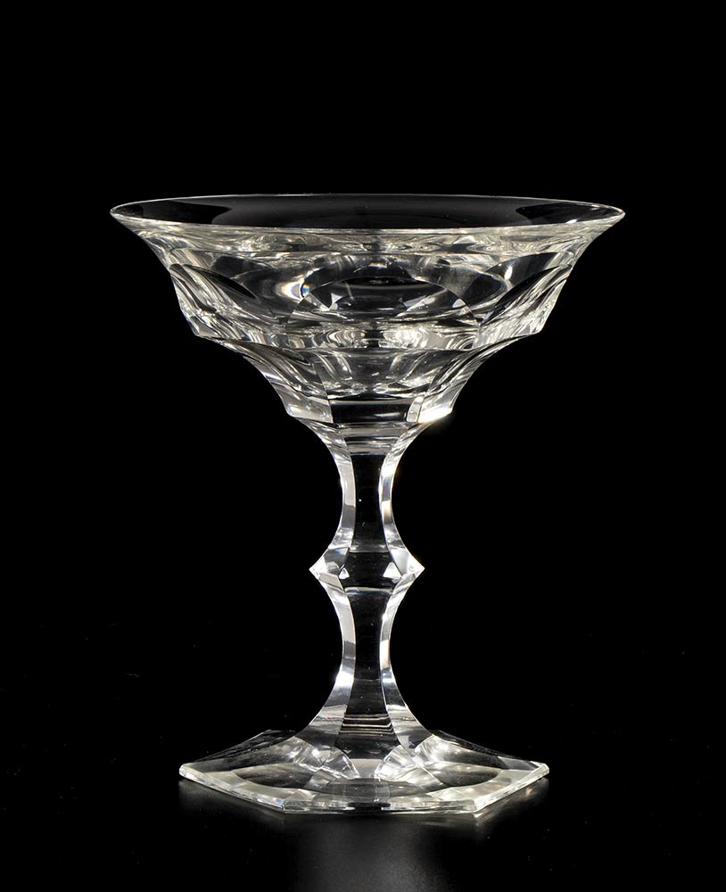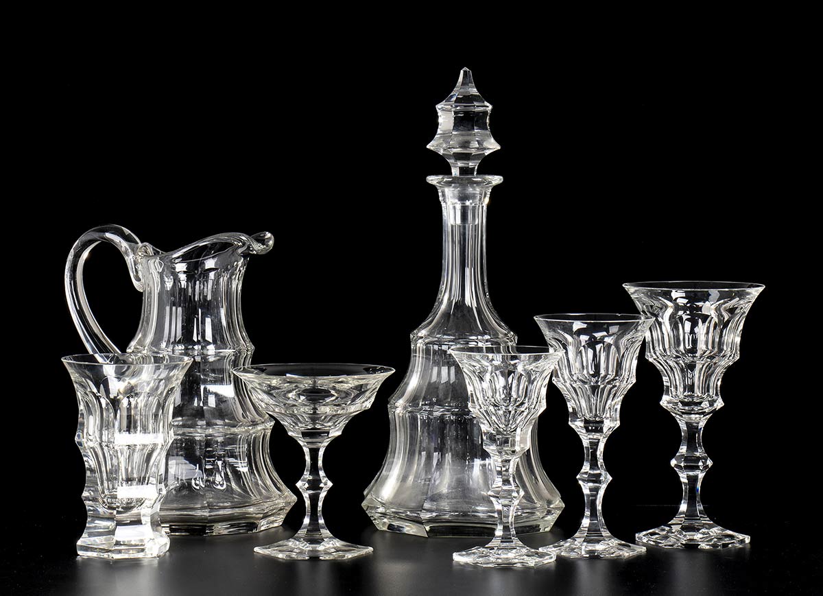 Parte di servizio di bicchieri in cristallo di Boemia piede esagonale e corpo sfaccettato. Composto da: bicchieri da acqua, vino bianco, vino rosso, liquore, coppe, da bibita, 1 bottiglia ed 1 brocca (tot pezzi 68).