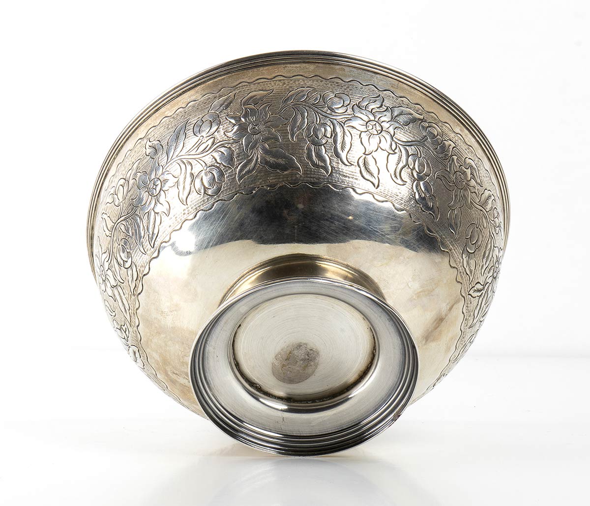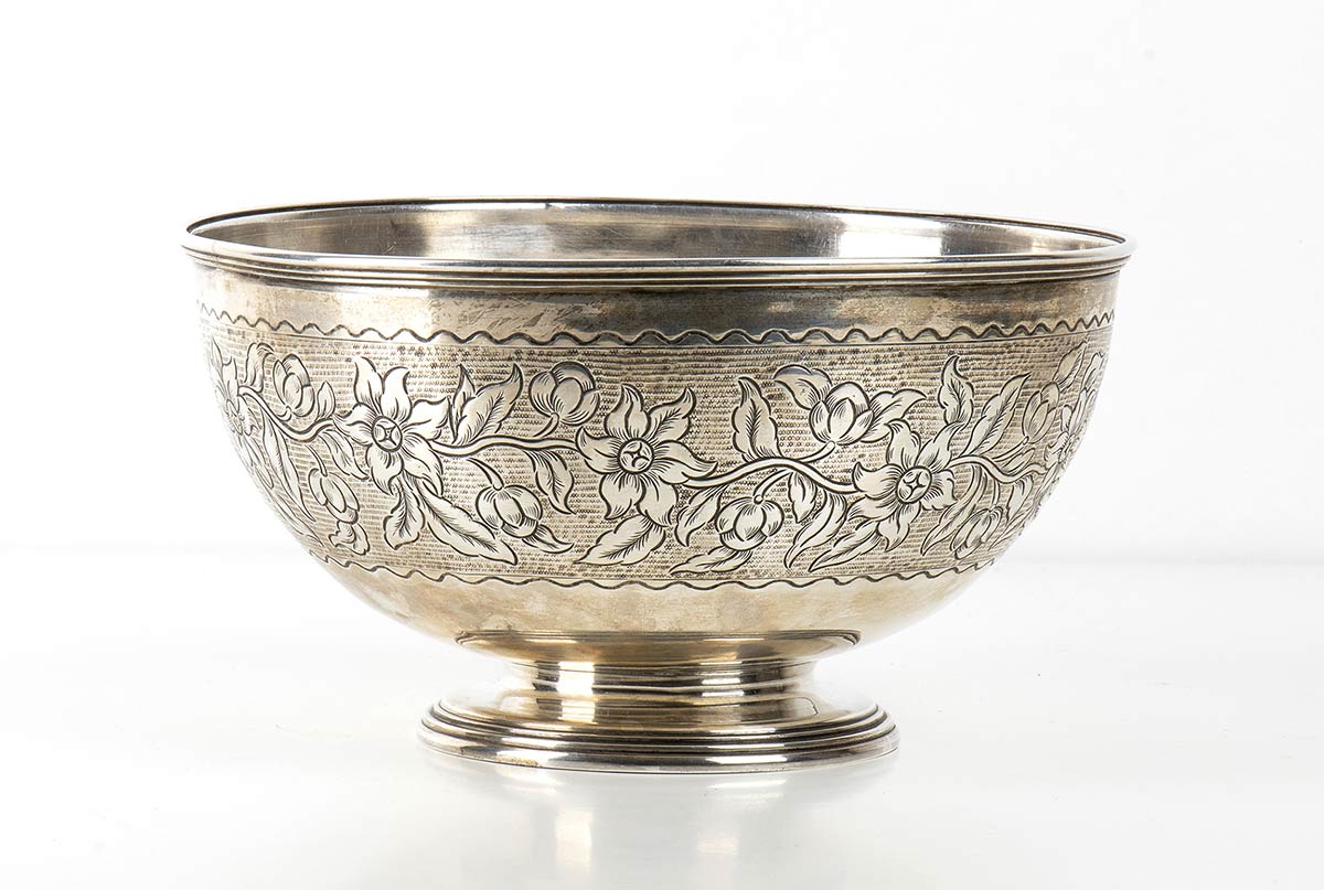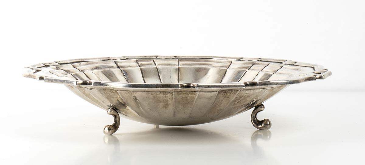 di forma sagomata poggiante su tre piedi, diametro 30,5 cm, altezza 5,5 cm, peso 1040 gr; ciotola di forma rotonda a decori floreali, diametro 20 cm, altezza 10,5 cm, peso 490 gr. Peso totale 1530 gr. Marchi non presenti. Stato di conservazione: *** discreto.