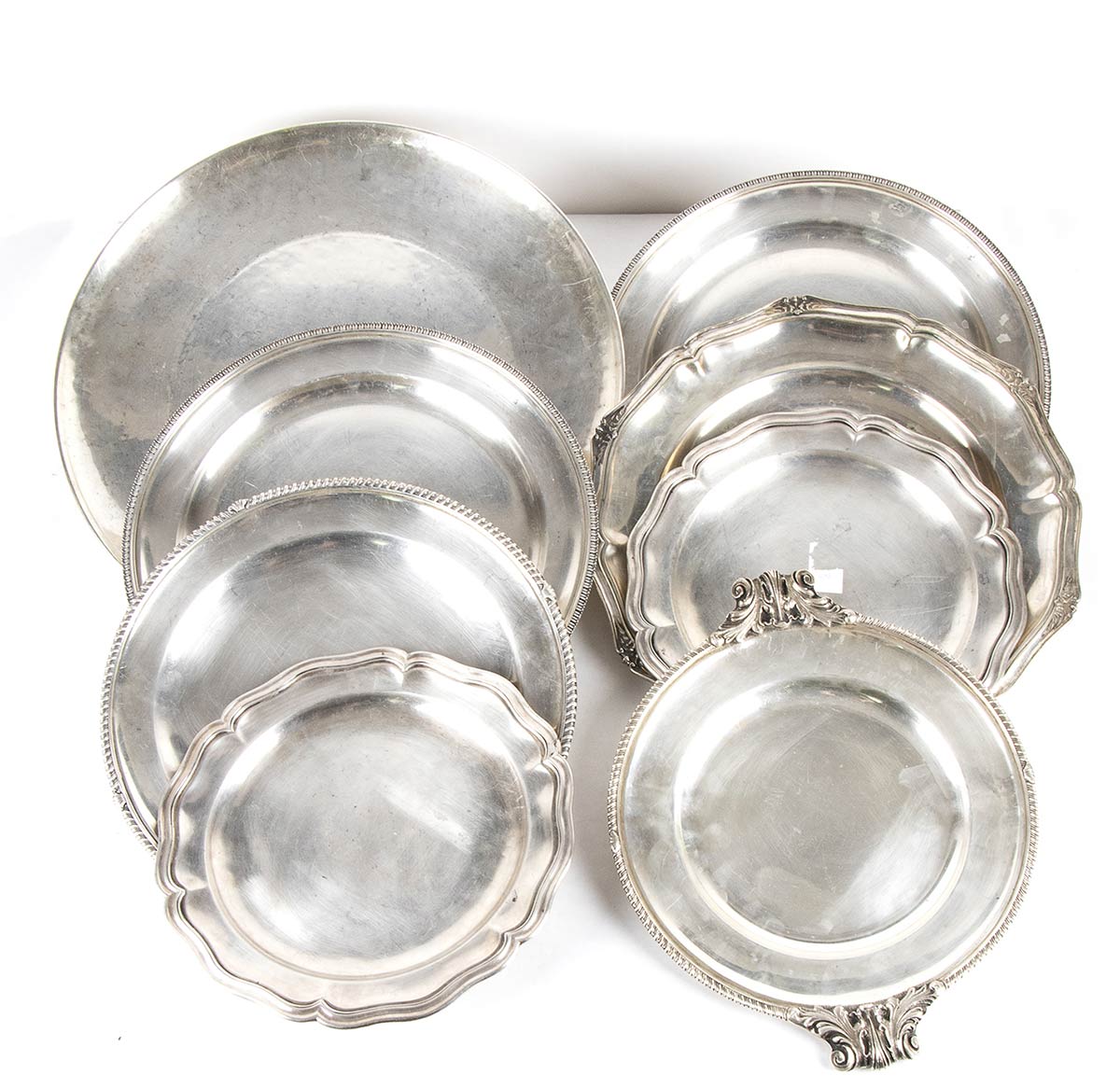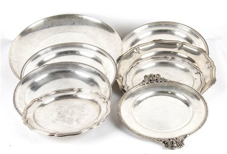 di forma rotonda di vari misure e pesi: con manico, punzonato "800 e 41 MI", peso gr 961, dimensioni 36 x 29 cm; una coppia, punzonati 800 e CIA", peso 1143 gr, diametro 28,5 cm; punzonato con marchio periodo fascista "431 MI", peso 1019 gr, diametro 33,5 cm; punzonato "800, Miracoli & Co e 8 MI", peso 997 gr, diametro 35 cm; punzonato "800, Miracoli & Co, e 8 MI", peso 987 gr, diametro 35 cm; punzonato "800", peso 1117 gr, diametro 37,5 cm; punzonato "800 e *... FI", peso 1872 gr, diametro 43,5 cm. Peso complessivo 8096 gr. Stato di conservazione: *** discreto (difetti).