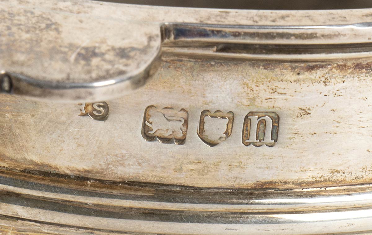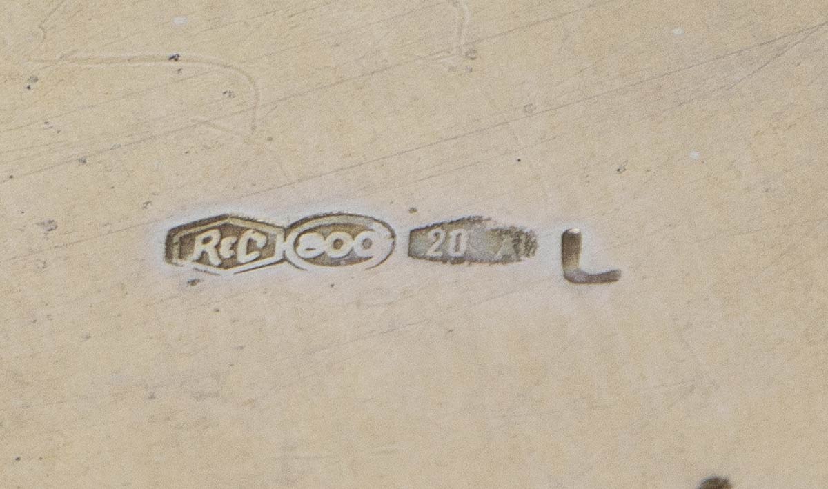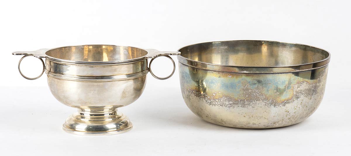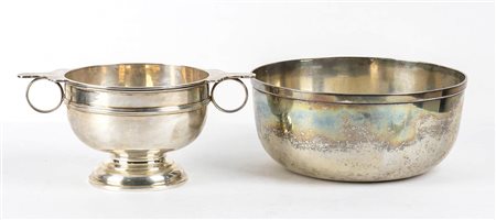 coppa con manici in argento 925/1000, punzonata con la serie completa di marchi Londra 1908-09, argentiere Robert Stocker, peso 587 gr, dimensioni 11 x 24,5 x 15,5 cm; ciotola in argento 800/1000 punzonata "800, R C e 20 AL", argentiere RICCI & C., peso 765 gr, diametro 23 cm, altezza 10 cm. Stato di conservazione: *** discreto.