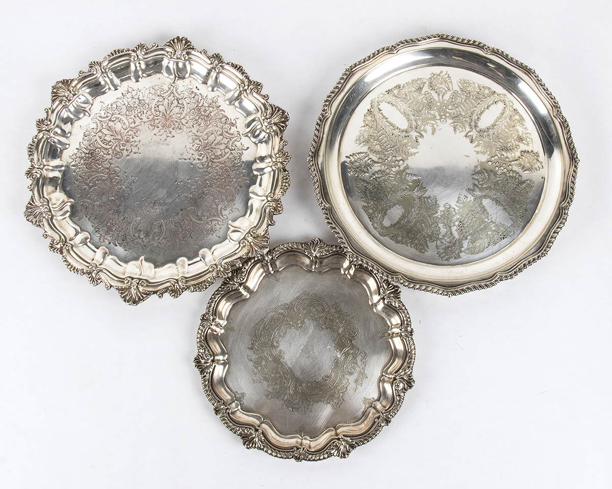 <br>Tre salver inglesi in metallo argentato - XX secolo