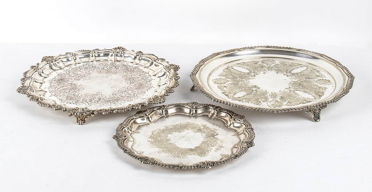 di forma rotonda con bordo applicato, due dei quali poggianti su tre piedi fogliati: in epns (electro plated nickel silver), diametro 25,5 cm, peso 640 gr; in epns (electro plated nickel silver), diametro 32,5 cm, peso 912 gr; in metallo argentato, diametro 33 cm, peso 1210 gr. Stato di conservazione: *** discreto.