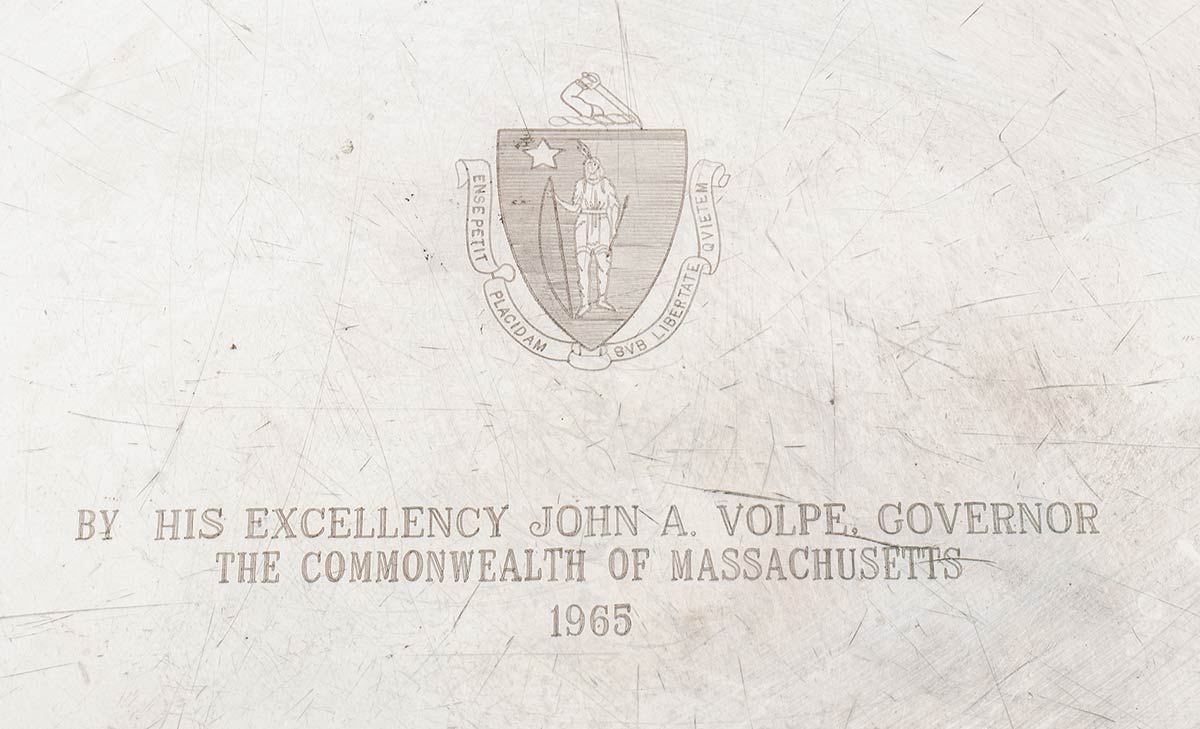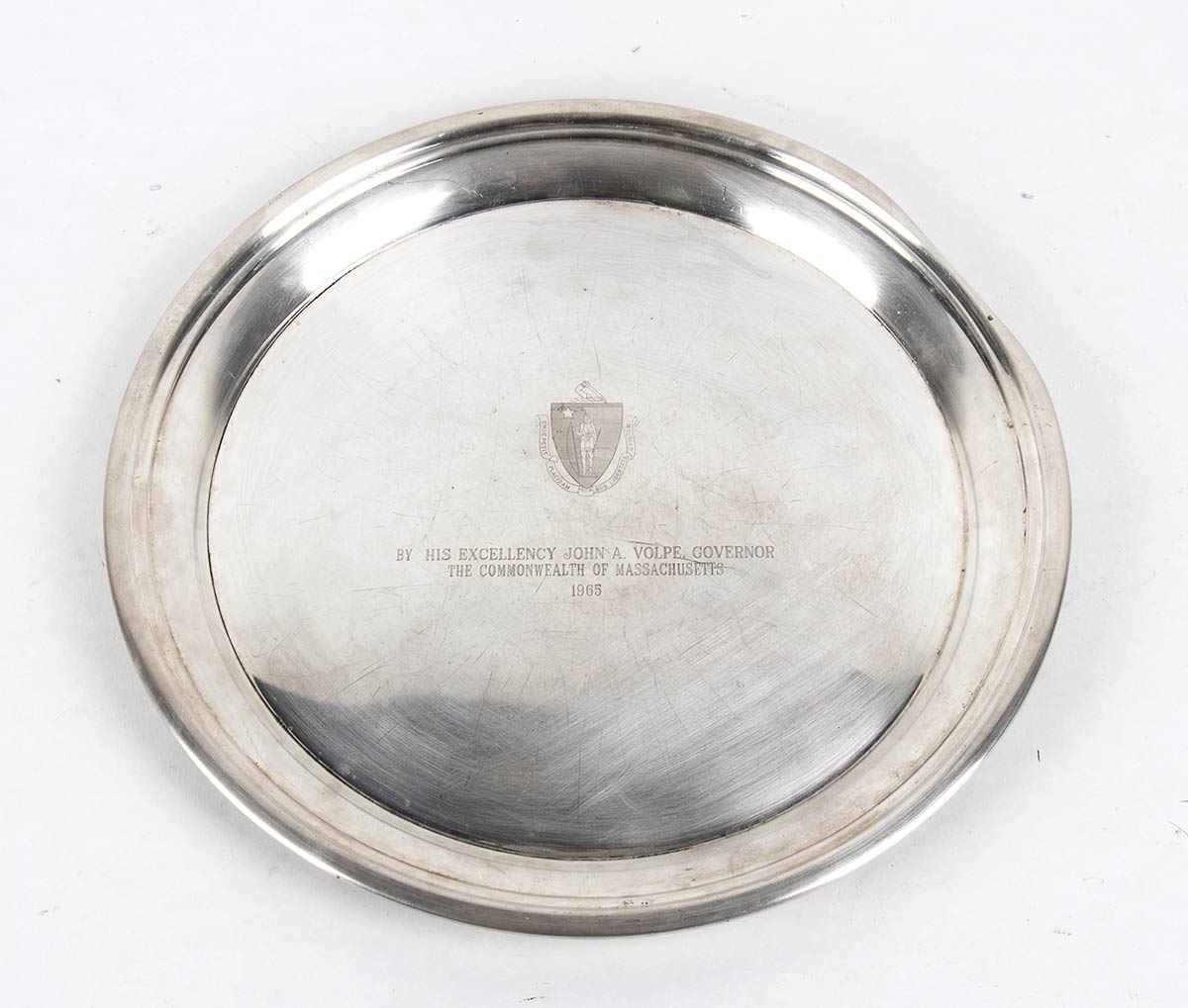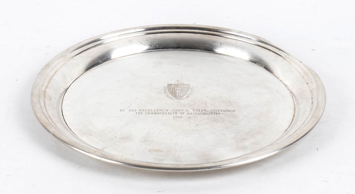di forma rotonda recante iscrizione-dedica "By his execllency John A. Volpe governor the Commonwealth of Massachusetts 1965". Peso 609 gr, diametro 33,5 cm. Stato di conservazione: *** discreto.