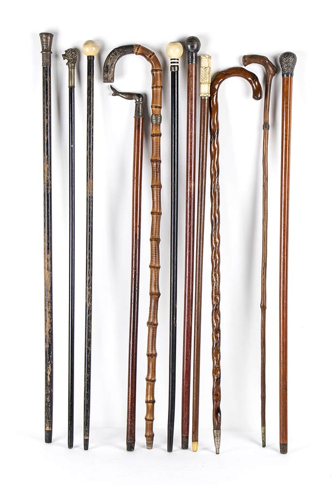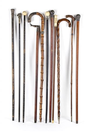 composta dai seguenti bastoni: con impugnatura a pomolo, asta in malacca e puntale in ferro, punzonato Londra 1891, altezza 91,2 cm, peso 255 gr; con impugnatura a pomolo in avorio di elefante (Loxodonta africana Blumenbach, 1797 o Elephas maximus Linnaeus, 1758), asta in legno ebanizzato, puntale in ebano, altezza 94 cm, peso 171 gr; con impugnatura a pomolo in avorio marino, accessoriato con bussola, altezza 94 cm; con impugnatura in osso, asta in legno chiaro, puntale in corno, altezza 91 cm; con impugnatura ad "L", asta in malacca, puntale in metallo, firmato "W.T. Burrons", altezza 83 cm, peso 323 gr; con impugnatura ricurva, asta in legno ritorto, puntale in ferro, altezza 88 cm, peso 278 gr; con impugnatura ricurva, asta in bambo, puntale assente, altezza 93 cm, peso 296 gr; con impugnatura a pomolo, asta in legno ebanizzato, puntale in legno, punzonato "silver plated", altezza 92 cm, peso 111 gr; con impugnatura a pomolo in metallo argentato, asta e puntale in legno, altezza 95 cm; con impugnatura a pomolo, asta in legno ebanizzato, puntale in legno, altezza 95 cm, peso 305 gr; con impugnatura ad "L" e manico in legno, puntale in ferro, altezza 91 cm, peso 111 gr. Stato di conservazione: *** discreto (difetti).