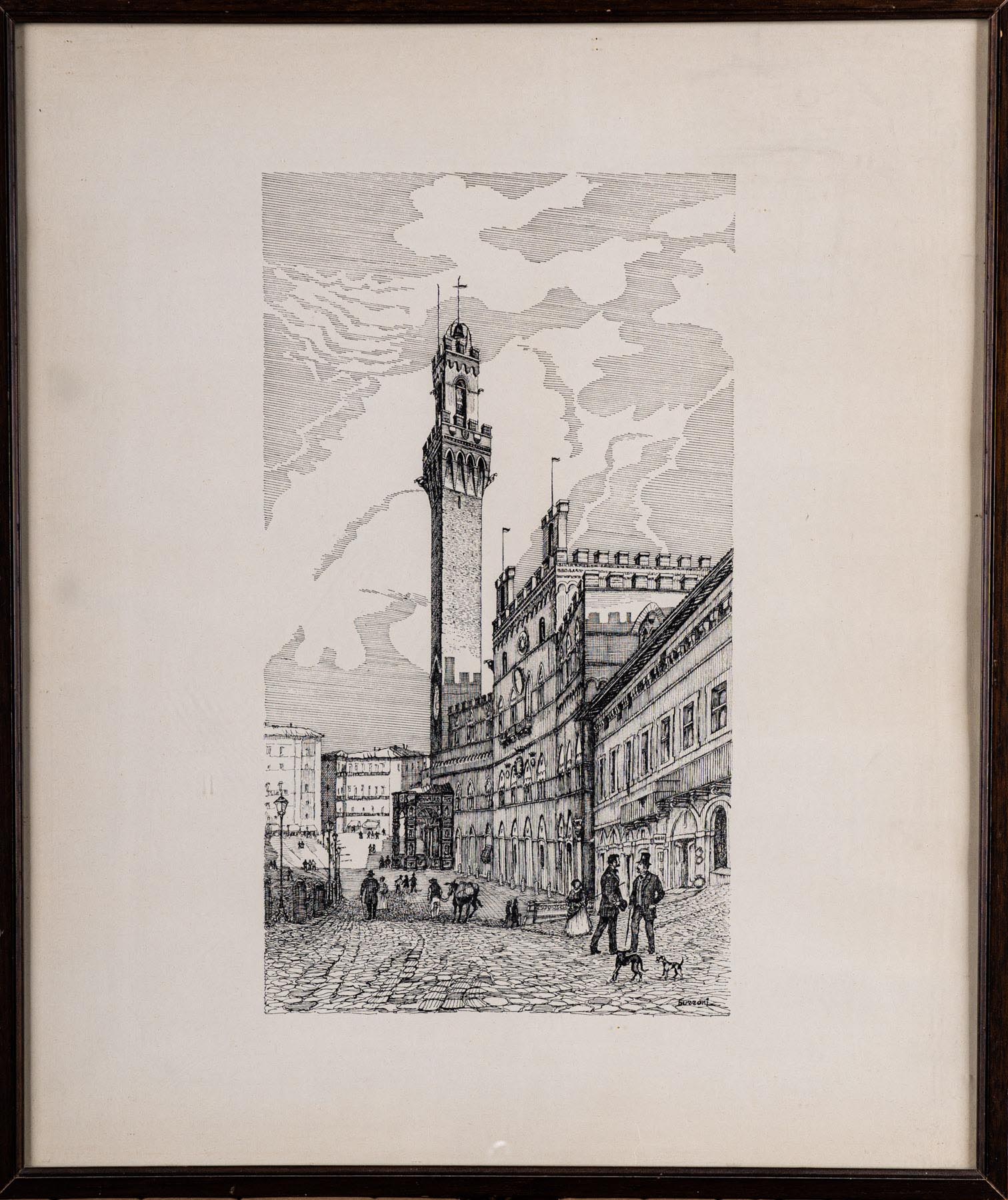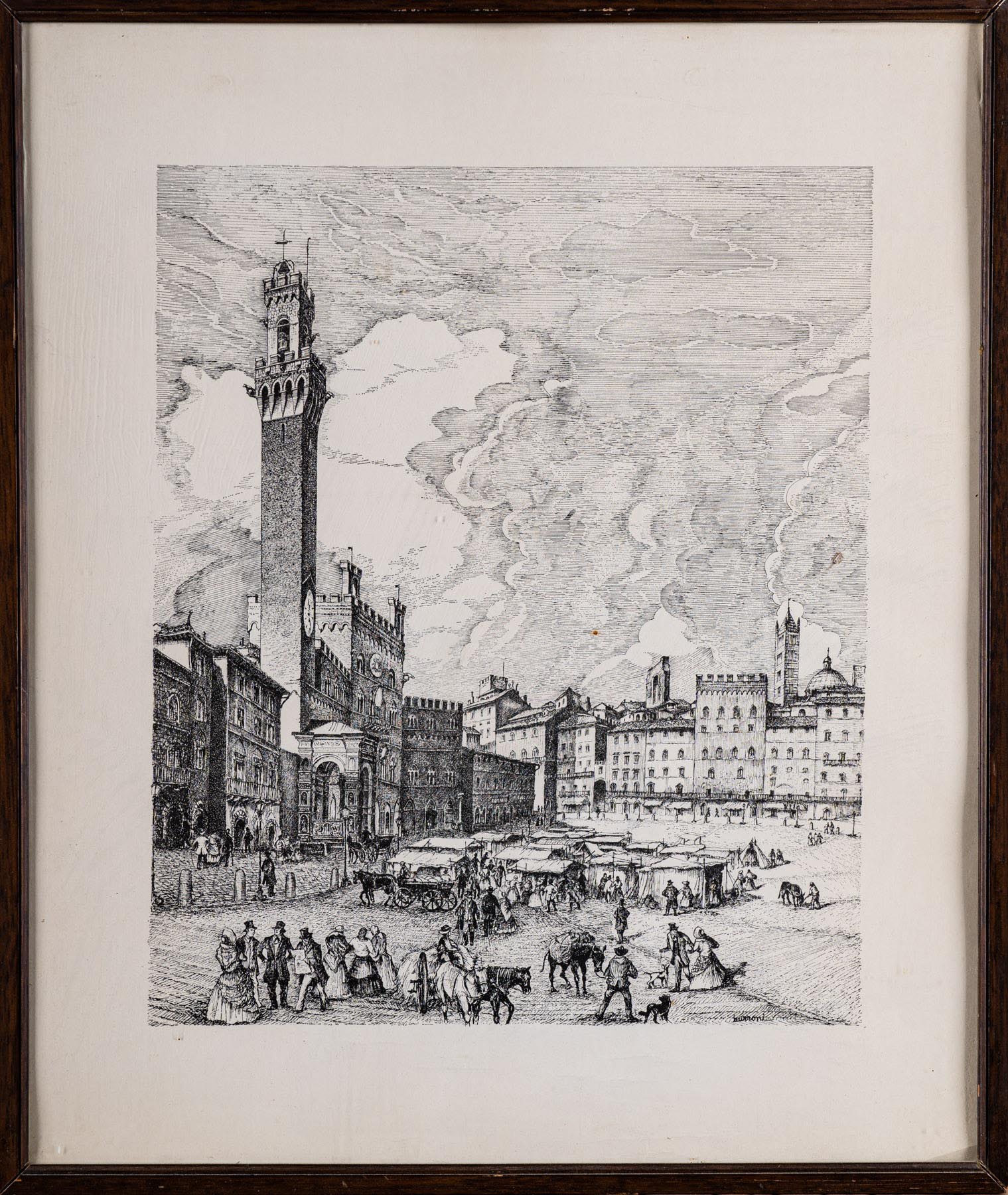 Lotto di due multipli su carta, raffiguranti vedute di Piazza del Campo, firmate Burroni