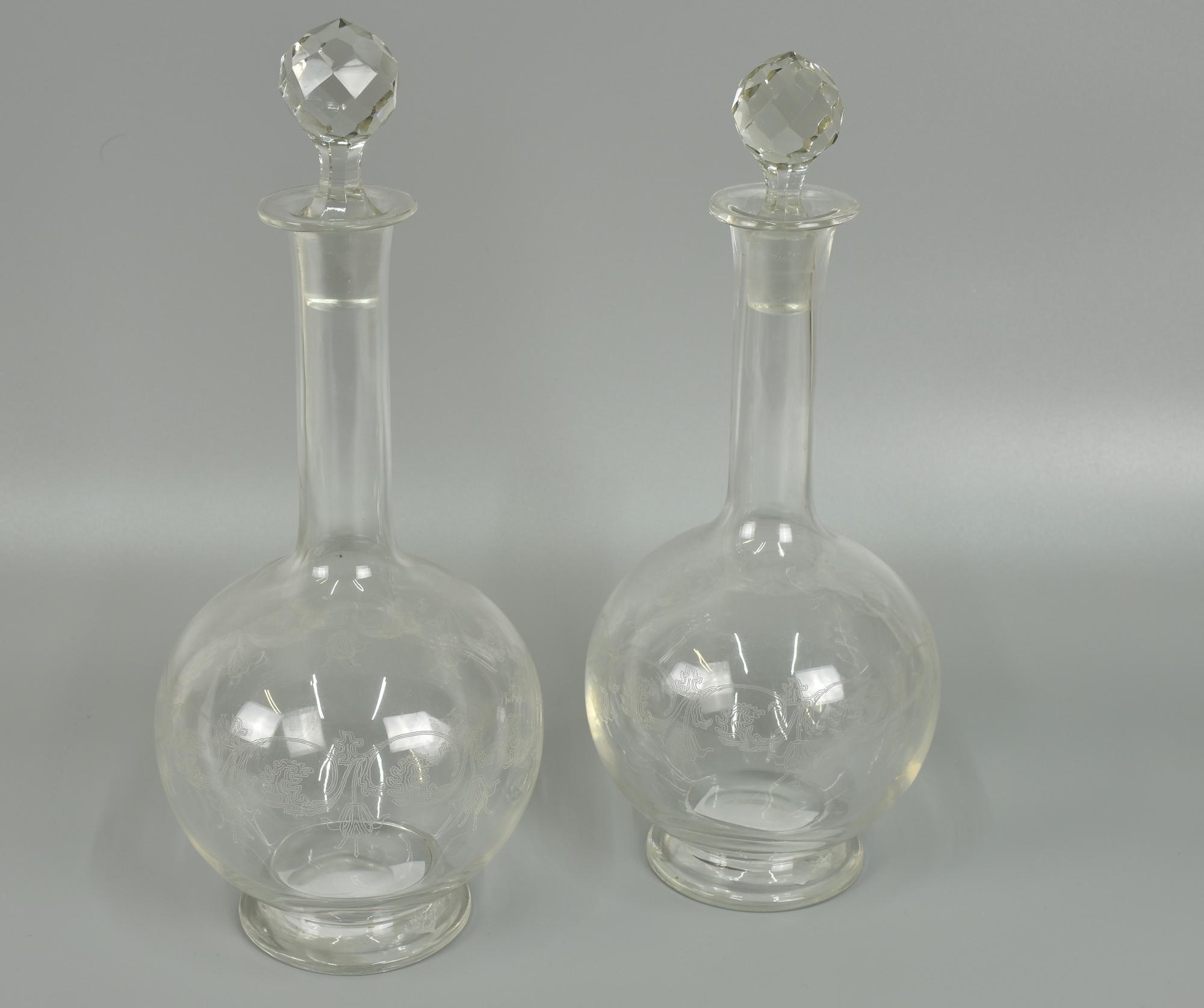 COPPIA DI BOTTIGLIE IN VETRO INCISO con tappo in cristallo, Italia inizio XX...