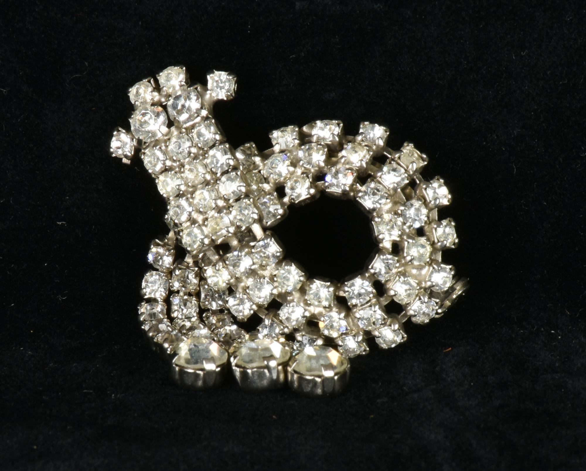 spilla a forma di fiocco con tre fili di pendenti in strasse tipo Swarowsky
