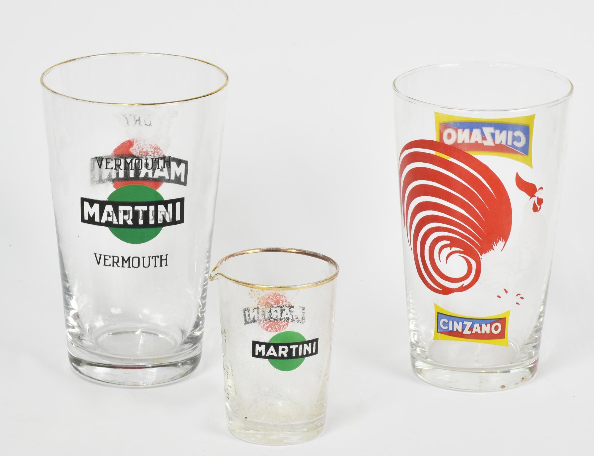 LOTTO DI TRE BICCHIERI PUBBLICITARI in vetro Martini e Cinzano h cm 20 e h cm...