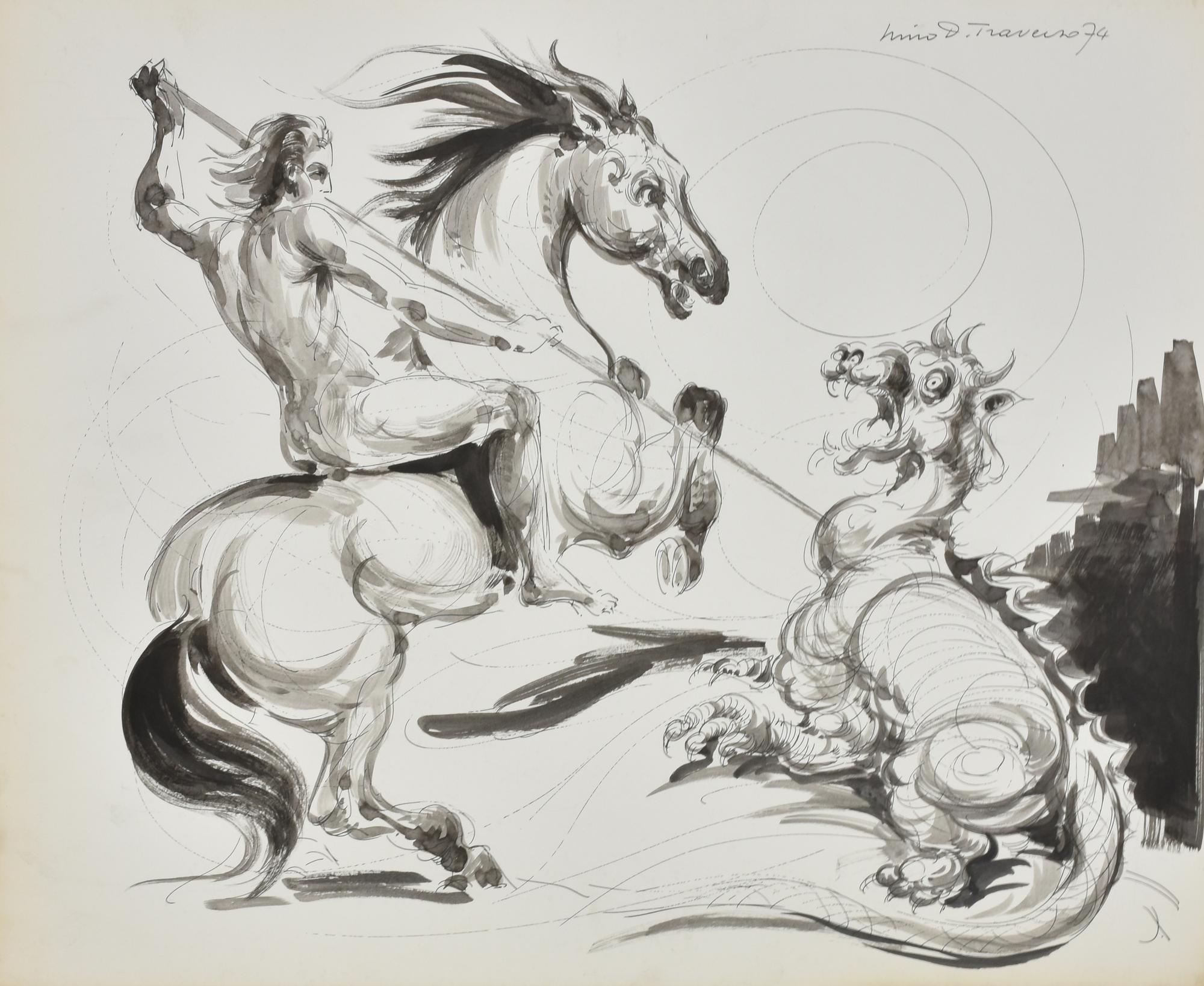 Nino Traverso SAN GIORGIO E IL DRAGO tecnica mista su cartoncino, cm 49x60...