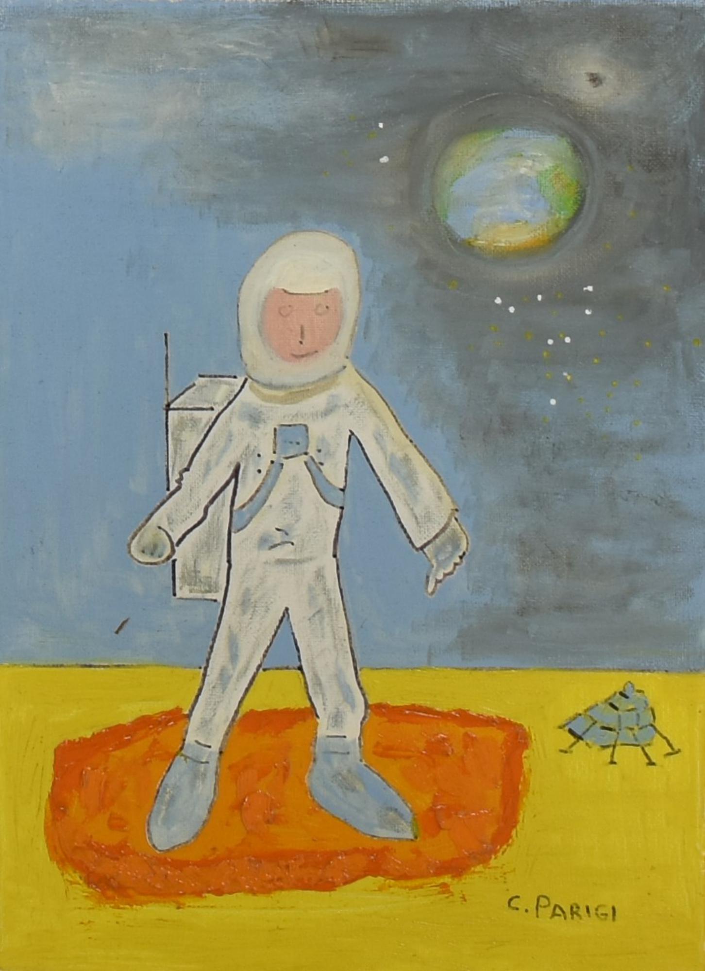 Claudio Parigi ALLUNAGGIO ATTERRAGGIO olio su tela, cm 35x25 firma sul retro:...