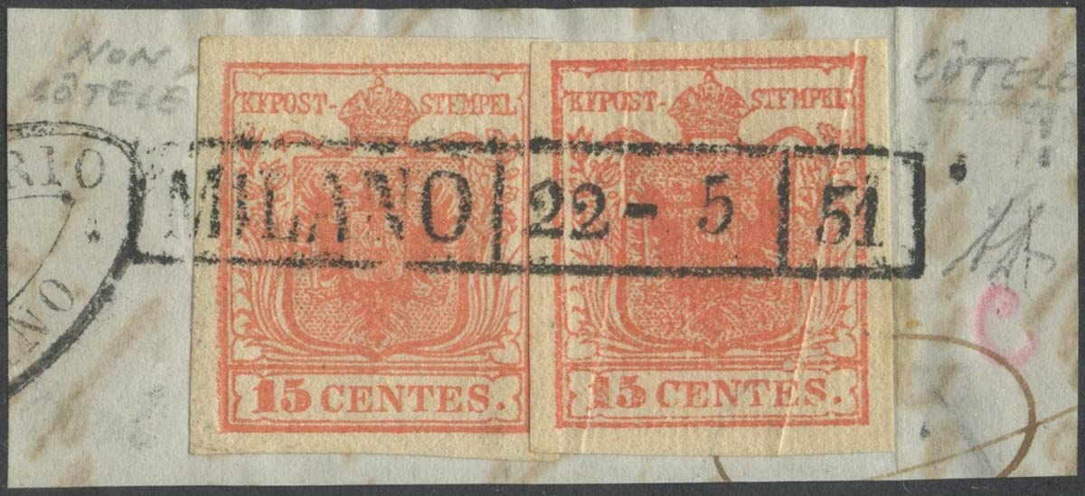 1851, Piccolo frammento composto da 15c. N.3f Rosso Vermiglio Chiaro e un...