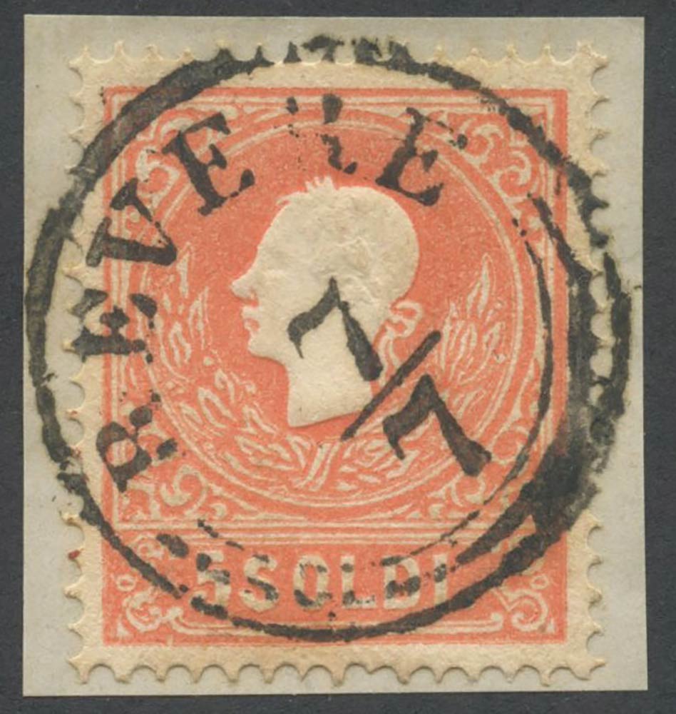 5s. N.30 Rosso su frammento annullato Revere, 7/7. (Lux) (Cat.19++)