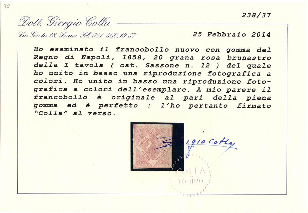 1858, N.12 Rosa Brunastro nuovo con gomma, linguellato. (A). (A.D., Cert.Colla) (Cat.15.000)