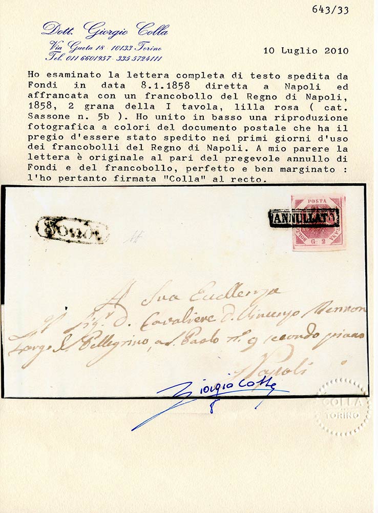 Lotto 158 | 05.01.58 (quinto giorno d'uso), Lettera da Fondi per Napoli affrancata con un...