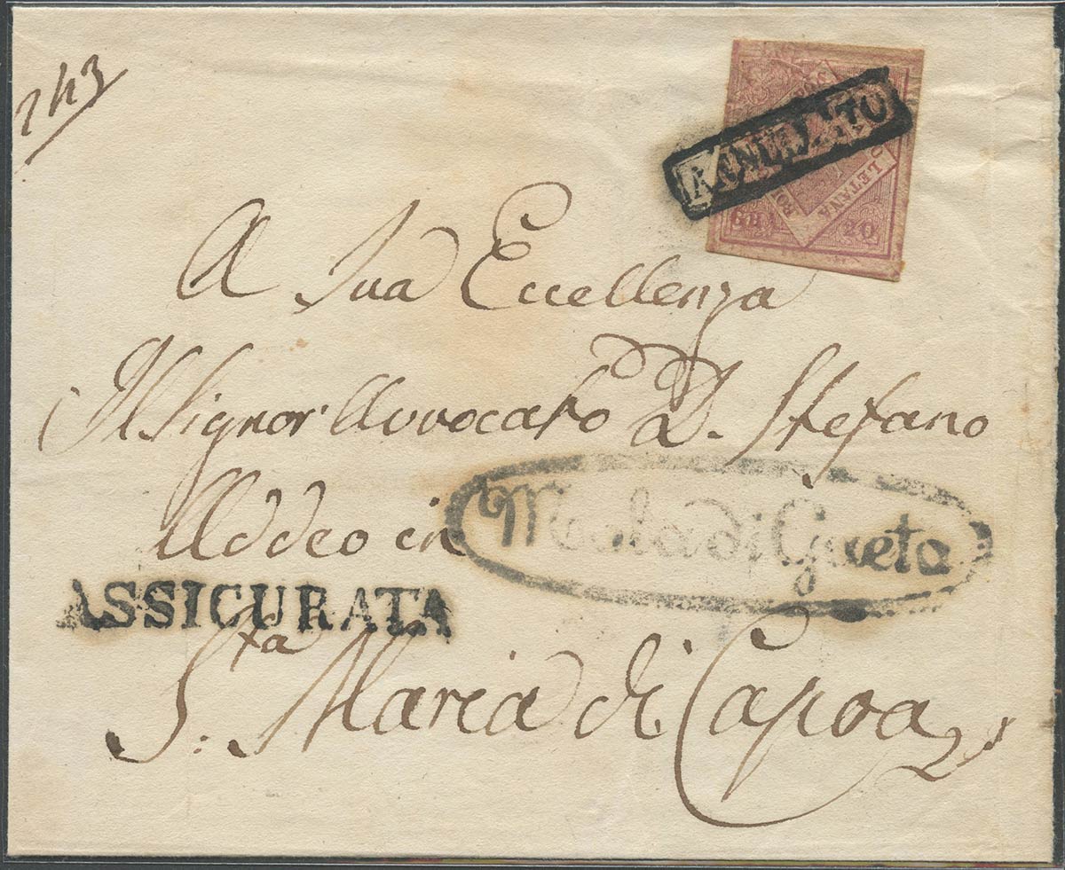 Lettera Assicurata da Mola di Gaeta (attuale Formia) per S. Maria di Capua affrancata con un 20gr. N.12a Rosa Lillaceo. Sul fronte il raro ovale di Mola di Gaeta e lo S.D. Assicurata (11pt.). (A-) (Cert.Colla) (Cat.12.850)