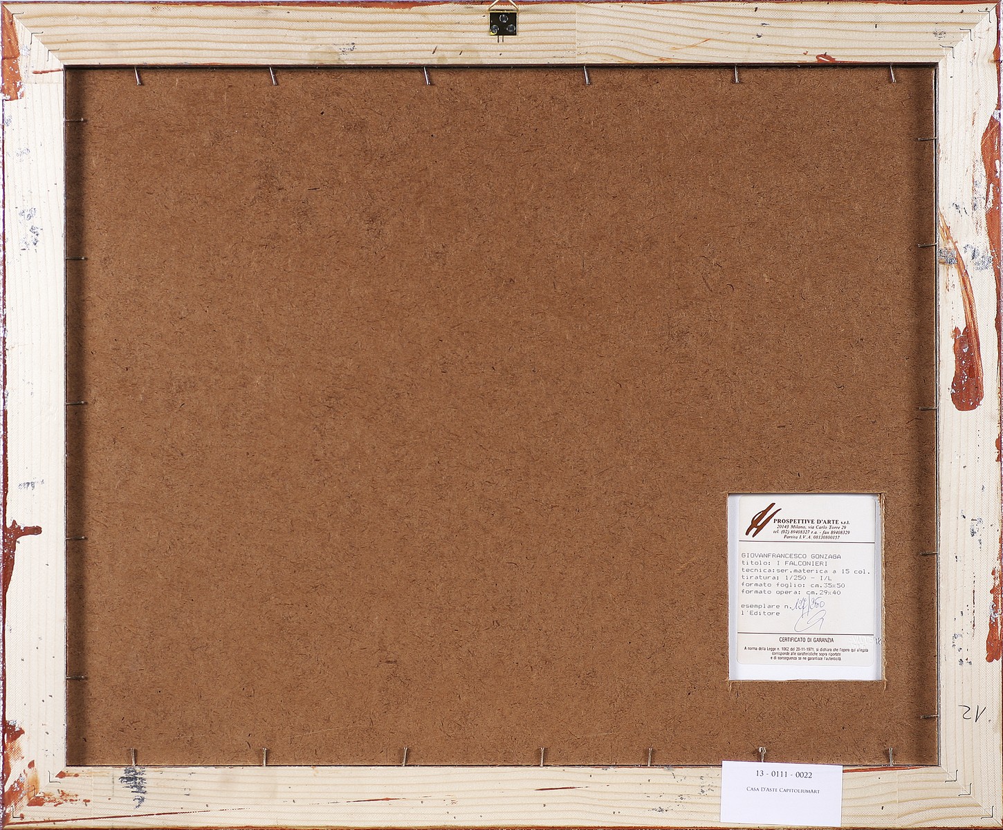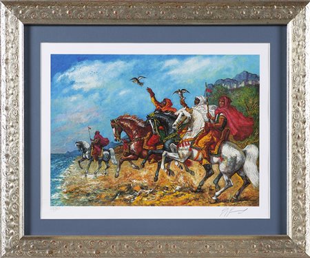 GONZAGA GIOVAN FRANCESCO (1921 - 2007) I falconieri. Serigrafia. Cm 50,00 x 35,00. Misure lastra: 29x40cm. Tir. 127/250 e firma in basso a matita. Al retro certificato di garanzia a cura di Prospettive d'arte srl, Milano. Cornice presente