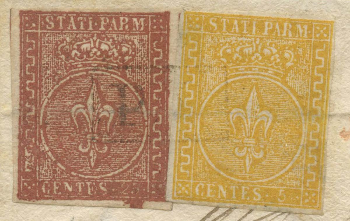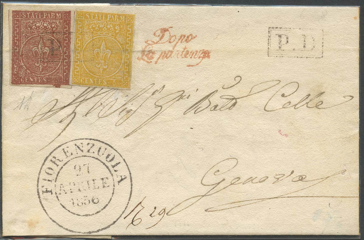 27.04.1856, lettera da Fiorenzuola per Genova affrancata per 30c. (tariffa di 1° porto per il regno di Sardegna stabilita nel 2° periodo tariffario 1/3/1855-9/6/1859) tramite un 5c. N.6 Giallo Arancio e 25c. N.8 Bruno Rosso. Sull'affrancatura l'annullo P.D. con doppio riquadro(9pt.) in dotazione all'ufficio di Fiorenzuola. Rarissima affrancatura bicolore non quotata. (A-) (A. Diena) (Cat.--)