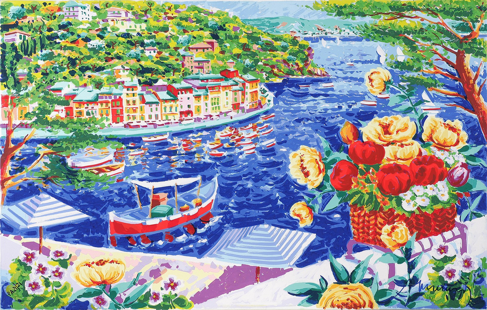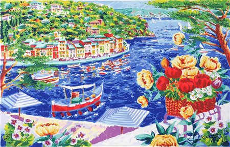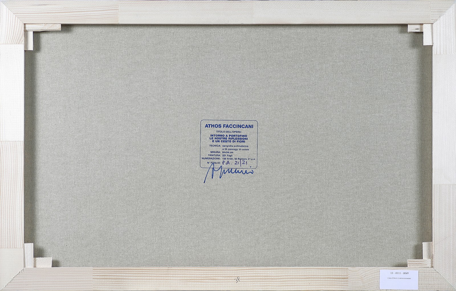 FACCINCANI ATHOS (n. 1951) Intorno a Portofino le nostre riflessioni e un cesto di fiori. Serigrafia. Cm 84,00 x 54,00 x 2,00. P.A. 21/21 e firma in basso. Al retro descrizione dell'opera.