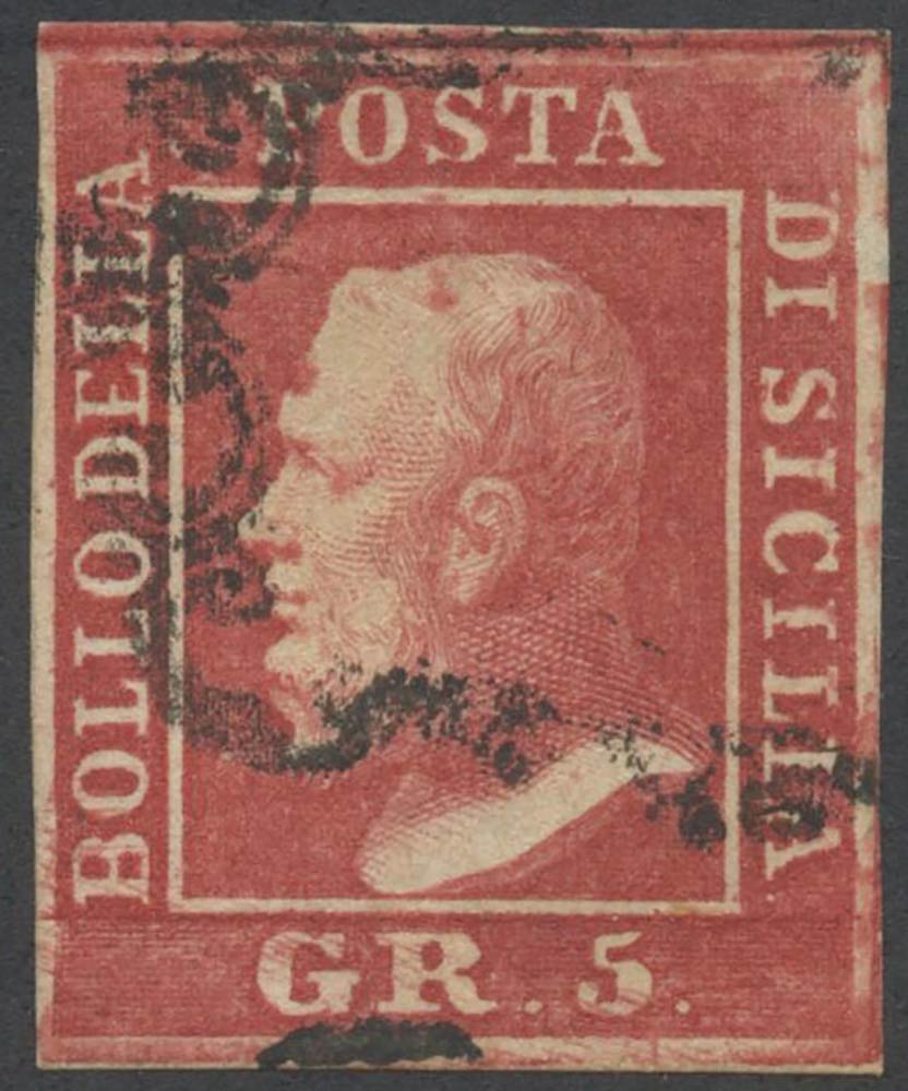 Lotto 459 | 1859, 5gr. N.9a Carminio (I tav), usato. Pos.99. (A+) (cert. Raybaudi)...