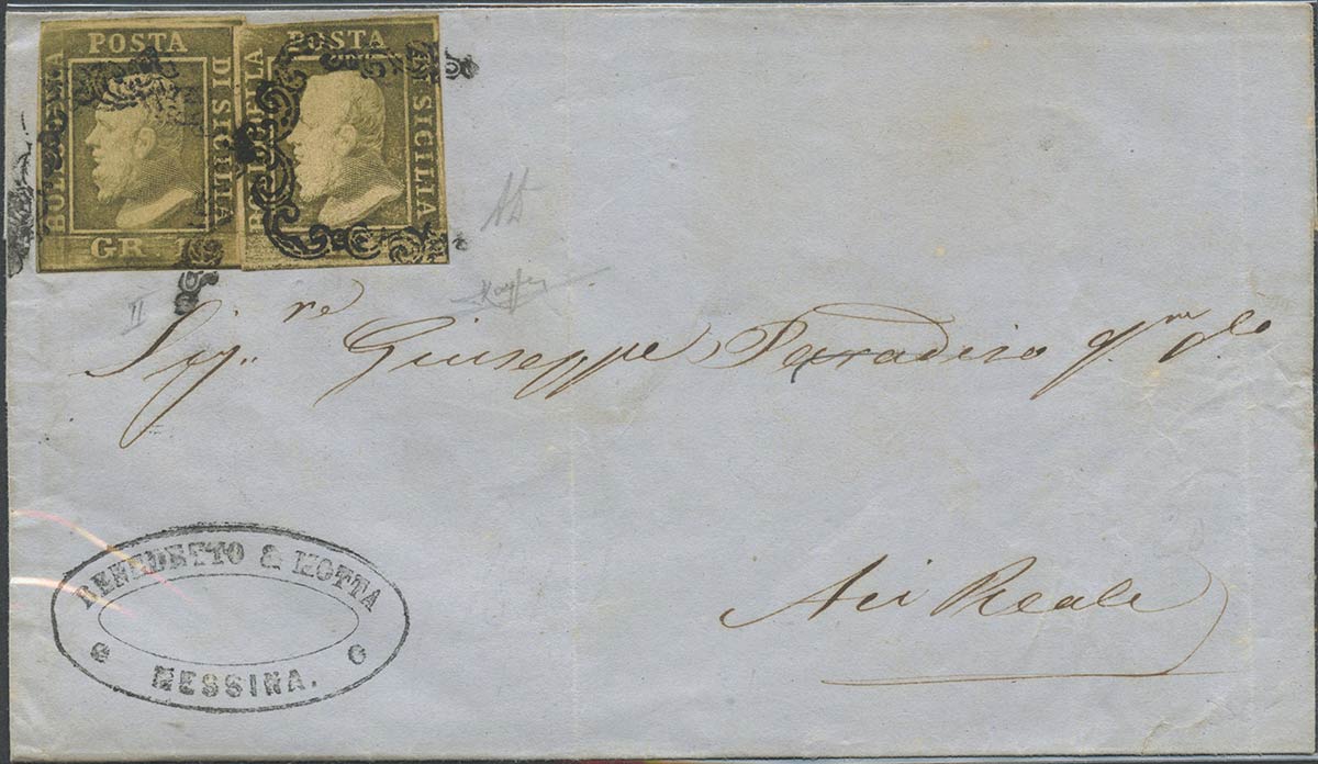 Lettera da Messina per Acireale affrancata per 2gr. Tramite due 1gr. N.4d Oliva. (A+) (A.Diena, Cert. Raybaudi) (Cat.2.400)