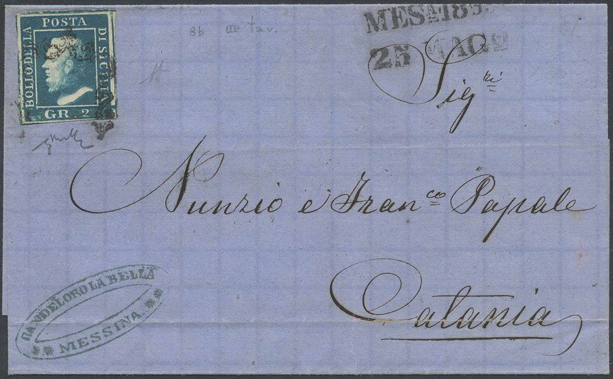 Lettera da Messina per Catania affrancata con un 2gr. N.8b Azzurro Verdastro (pos. 61). (A) (Chiavarello, A. Diena) (Cat.1.000)