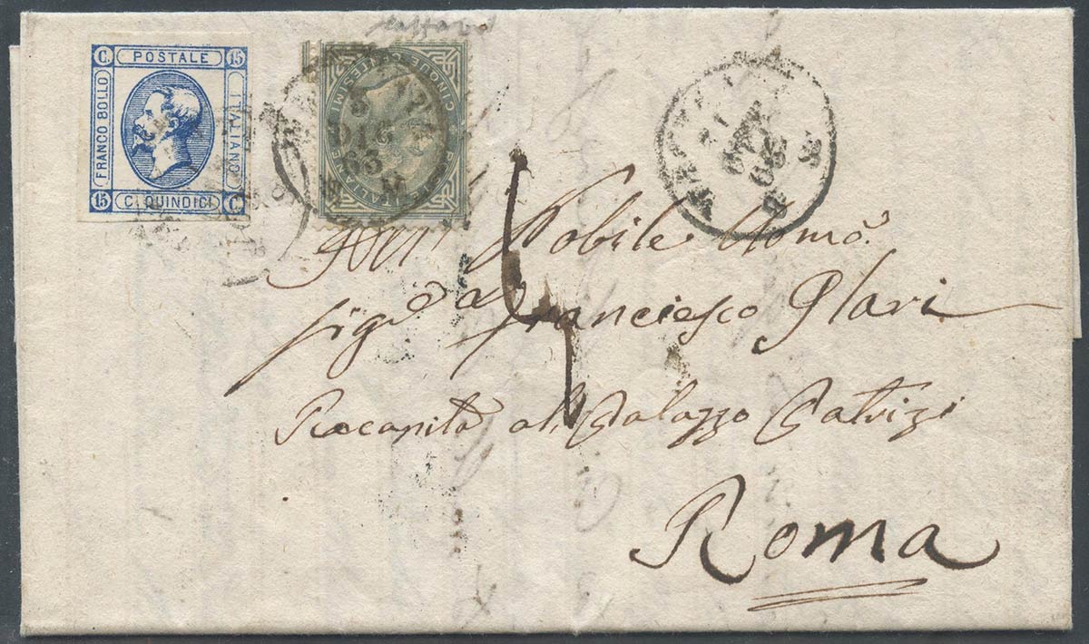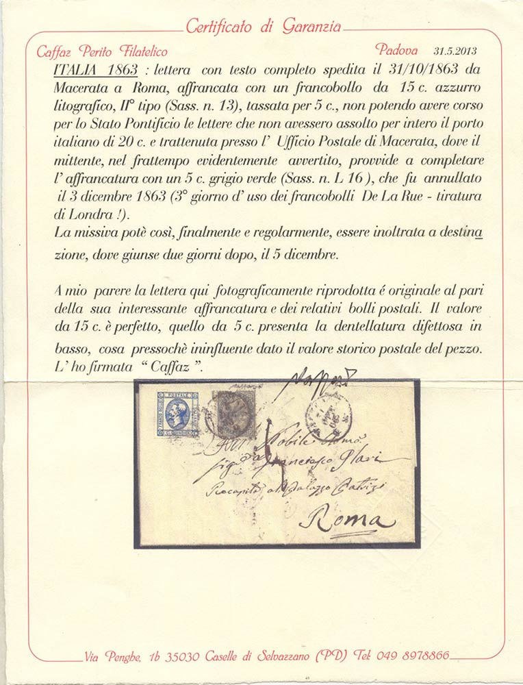 Lettera del 31 Ott. 1863 da Macerata a Roma affrancata con 15c. Azzurro II tipo N.13, tassata per 5c. Non potendo avere corso per lo Stato Pontificio le lettere che nonn avessero assolto per intero il porto italiano di 20c., la lettera fu trattenuta dall'ufficio Postale di Macerata dove l'affrancatura venne successivamente completata con un 5c. D.L.R. annullato il 3 Dic. 1863 (3° giorno d'uso dei D.L.R.) La missiva fu così inoltrata ginse a destino il 5 Dic 1863. Qualità A/B. (Cert Caffaz)
