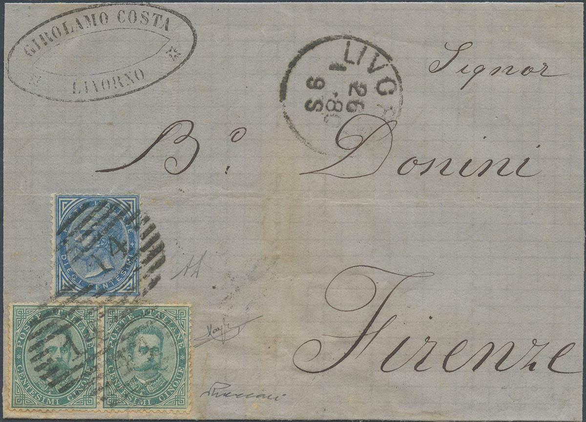Lettera del 26 Gen 1880 da Livorno a Firenze con affrancatura ''Due Re'' composta da 10c. Azzurro N.27+ 5c. Verde N.37x2