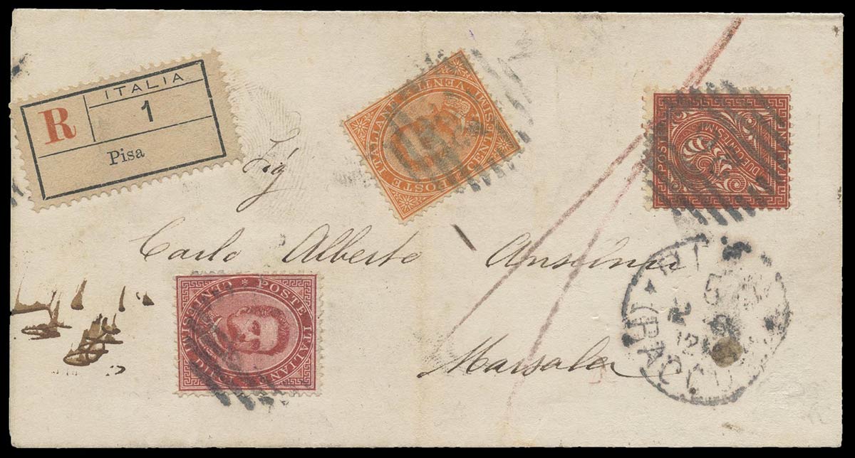 Lettera raccomandata da Pisa per Marsala con affrancatura 'due re' composta...