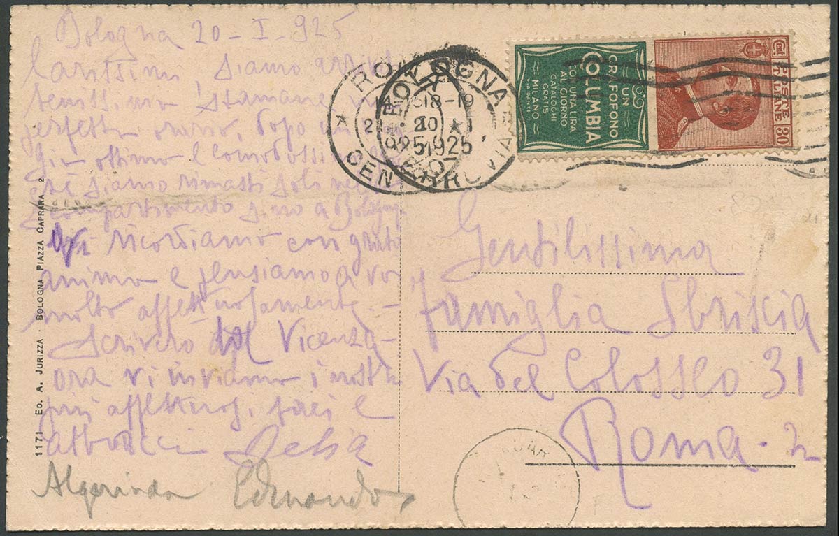 Cartolina da Bologna a Roma affrancata con 30c. Columbia N.9