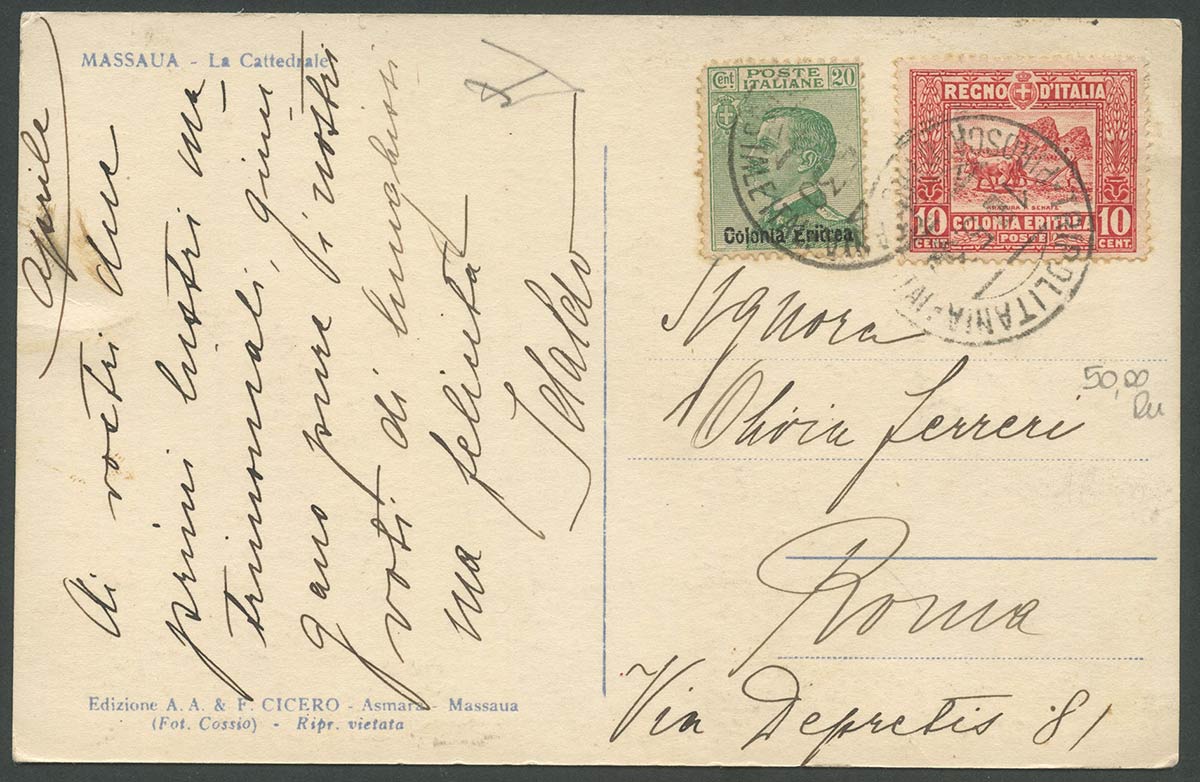 Eritrea, cartolina daTripolitania a Roma affrancata con 20c. Verde N.93 +...